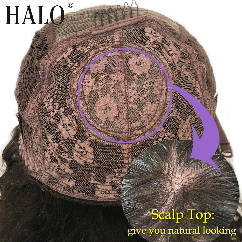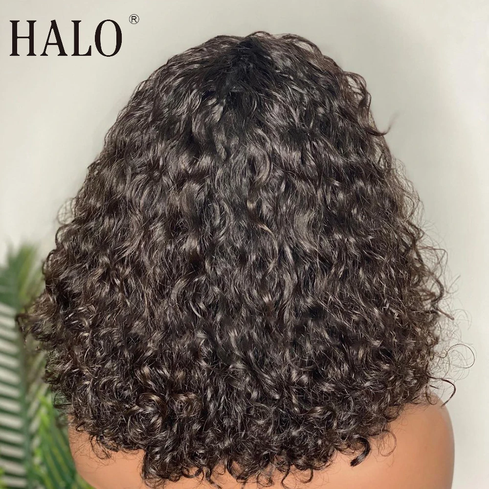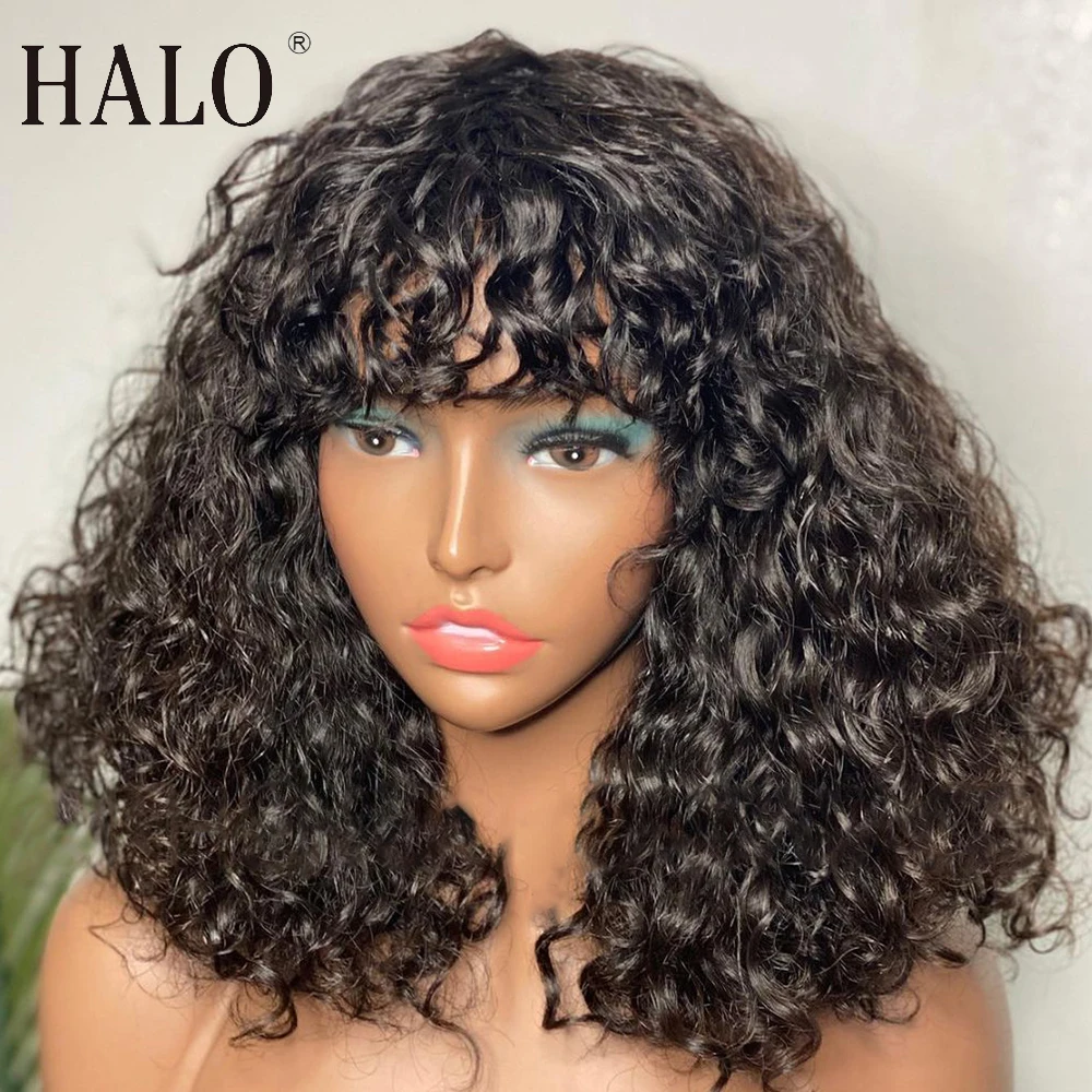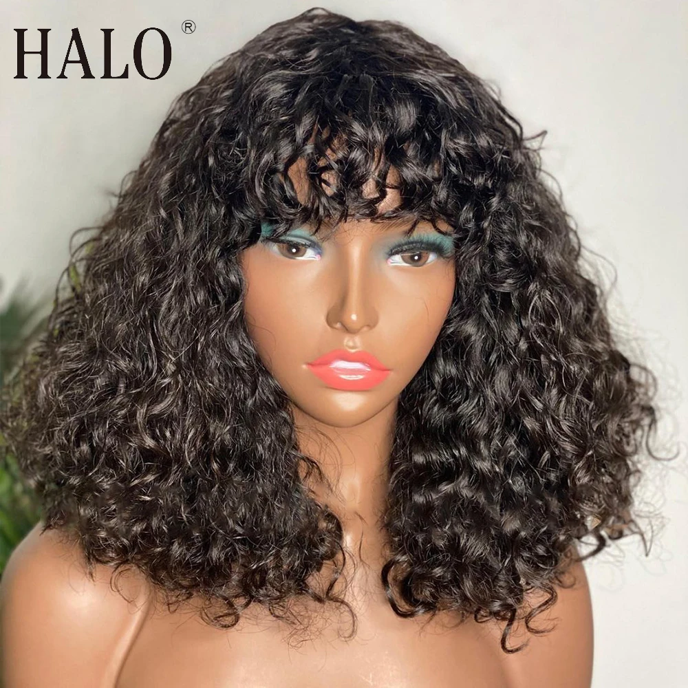 Парики с кудрявыми человеческими волосами HALO с челкой, парик с верхней частью головы машинной работы, парик без повреждений, бразильский короткий кудрявый парик, парики с глубокой волной для женщин