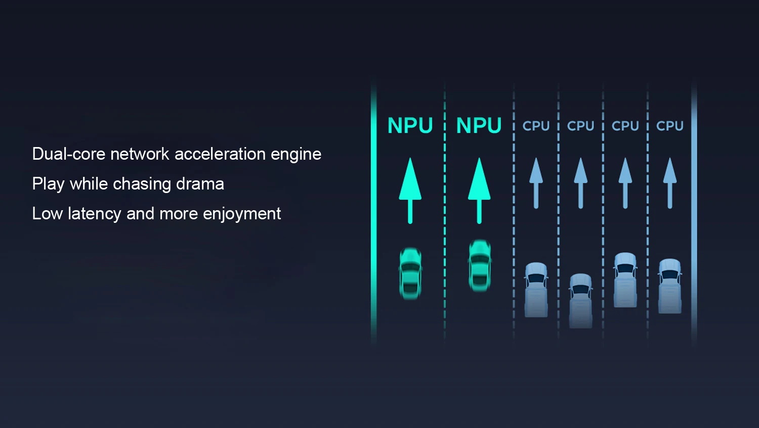 Двухъядерный 1,7 ГГц сети ускорение двигателя (NPU) предназначена для обработки сети передача данных и уменьшить Процессор нагрузки. Когда несколько полос обрабатывают данные и несколько приложений совпадают, происходит меньшая задержка и ожидание.