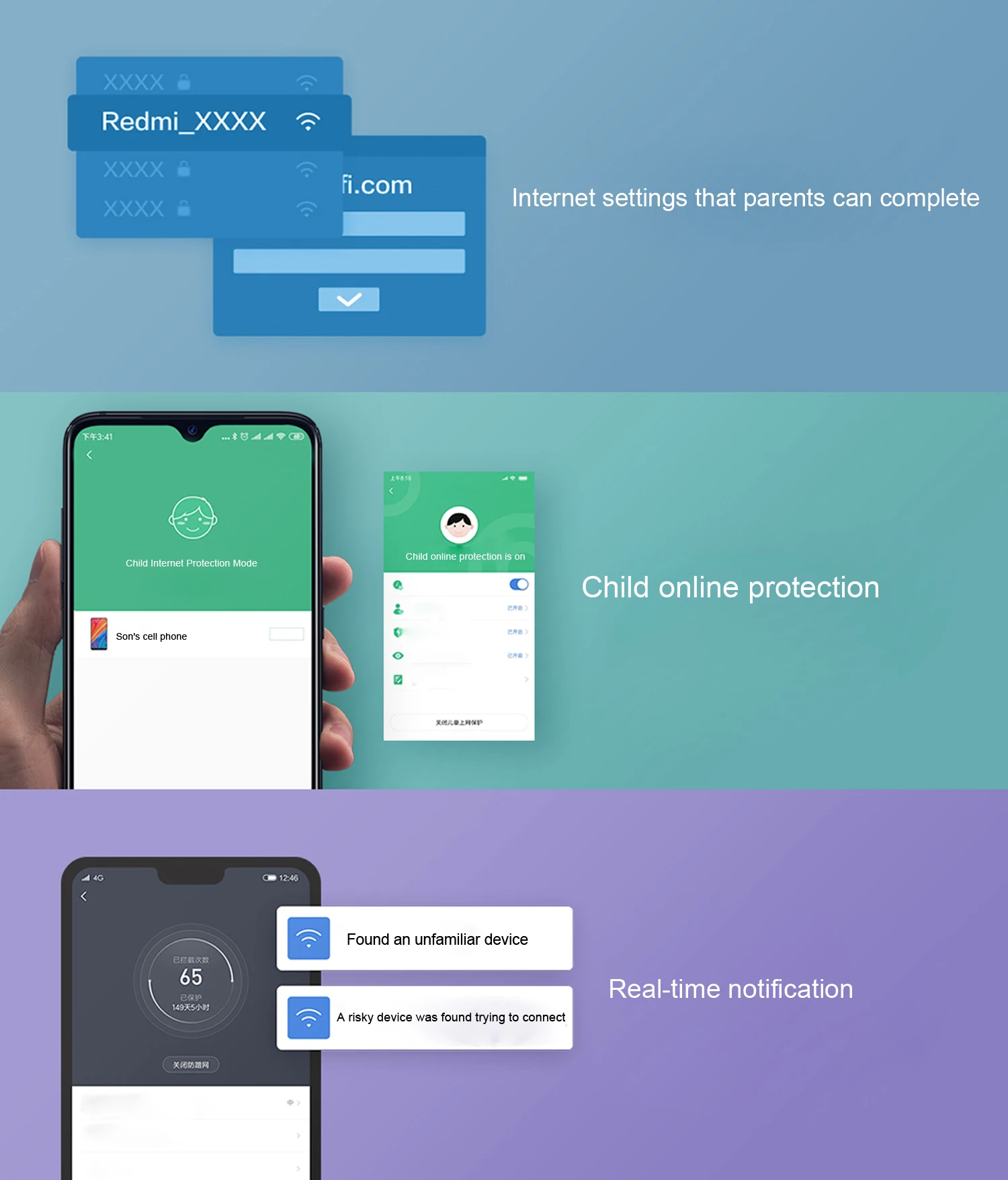 Простые и быстрые настройки Интернета, детская защита от Интернета, Поддержка настройки сетевого времени устройства и допустимый диапазон доступа для защиты здоровья детей в Интернете. Если вы обнаружите, что незнакомое устройство протирает сеть, вы можете взять на себя инициативу, чтобы отправить напоминания об уведомлениях, и поддержка отключения одним нажатием на мобильный телефон.