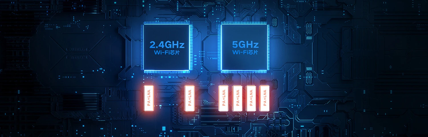 2,4 ГГц и 5 ГГц полосы частот оснащены 2 и 4 высокопроизводительный независимый усилитель сигнала (PA + LNA) соответственно Улучшенная мощность передачи сигнала и чувствительность приема, сильнее через стены