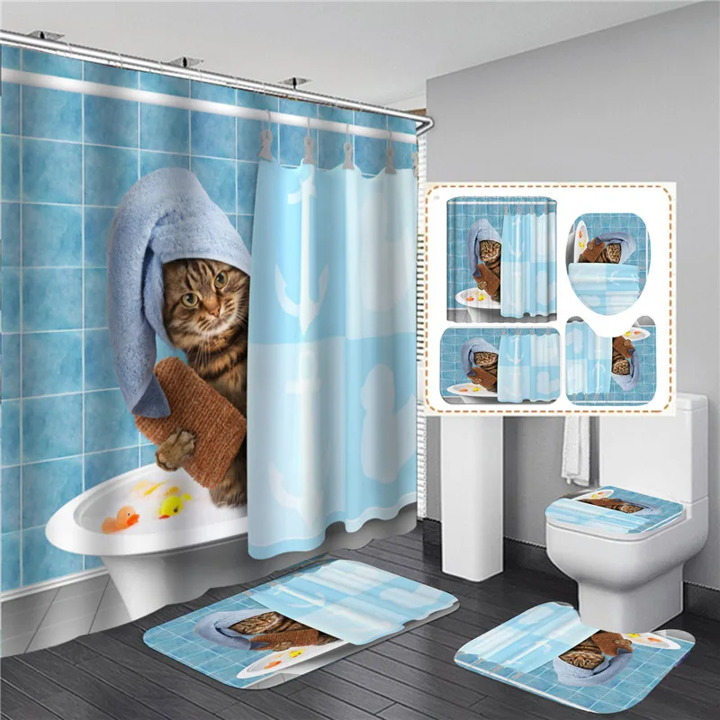 Крутая занавеска для ванной комнаты с рисунком кошки и животных, занавеска для душа с противоскользящими ковриками для ванной, домашний коврик, крышка унитаза, крутая занавеска с кошкой