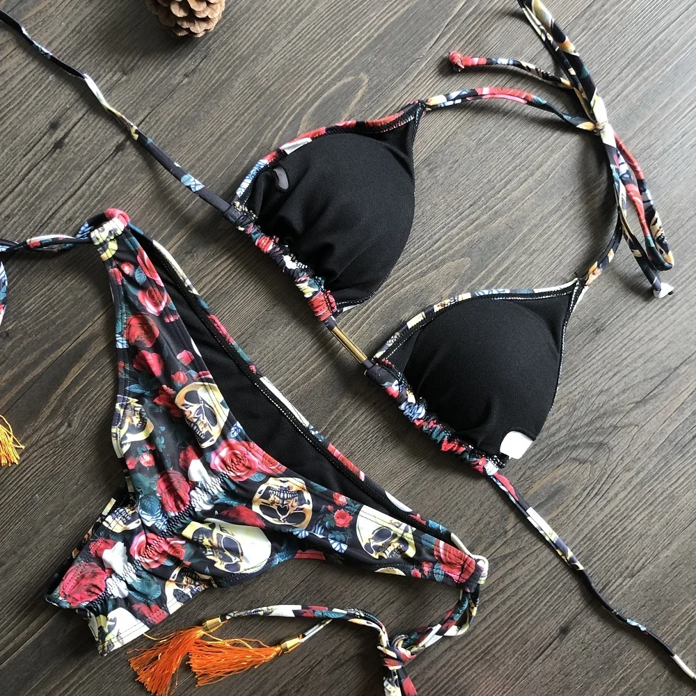 Сексуальный купальник Для женщин с принтом череп, пуш-ап, бразильские бикини Лето ванный комплект бикини с велосипедом, бикини 2021 купальники Для женщин