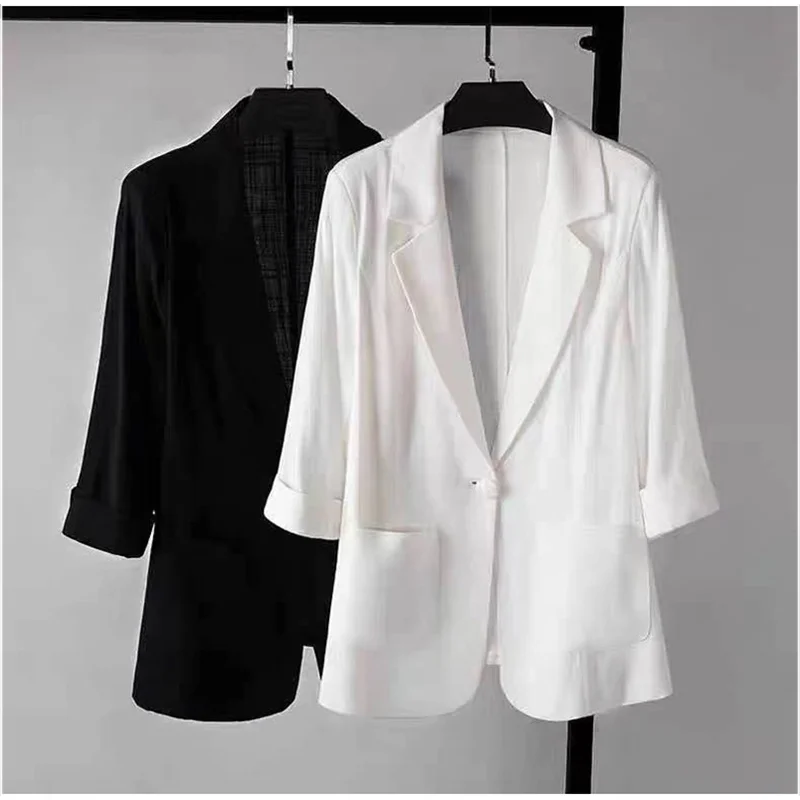 Женский Тонкий Блейзер из хлопка и льна, черный облегающий повседневный деловой блейзер с рукавами 2021 в Корейском стиле для работы, лето 34
