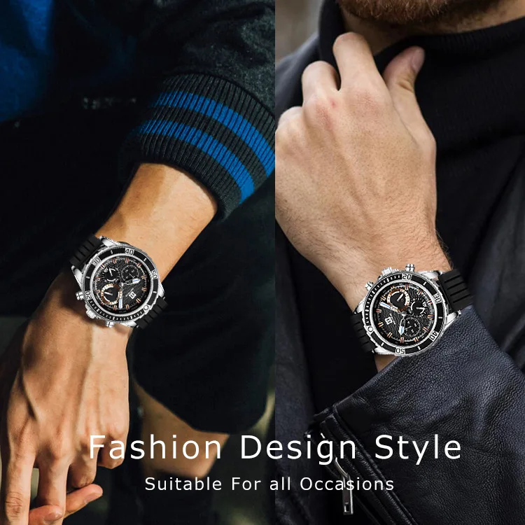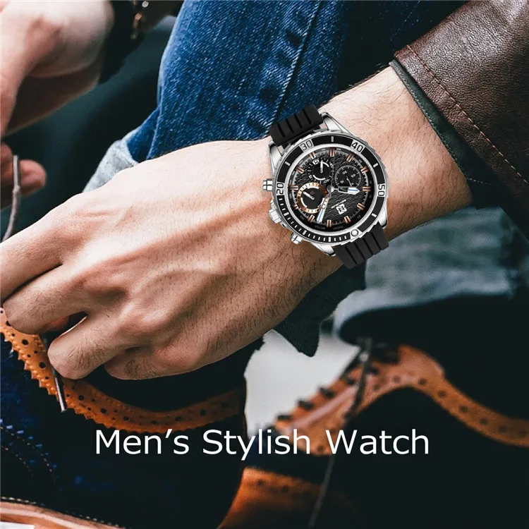 Бренд: GESITOТип застежки: ПряжкаДлина ремешка: 26 смСтиль: Модный и повседневныйМеханизм: кварцевыйГлубина водонепроницаемости: 3 барМатериал корпуса: сплавТолщина корпуса: 11 ммМатериал окна циферблата: HardlexНомер модели: ABN6013GШирина ремешка: 20 ммФорма корпуса: круглыйТип товара: кварцевые наручные часыМатериал коробочек и чехлов: бумагаТип материала ремешка: силиконОсобенность: Автоматическая ДатаОсобенность: ХронографОсобенность: Полный календарьОсобенность: светящиеся стрелкиДиаметр циферблата: 39 ммСтиль часов: модный, классический, Деловой, ПовседневныйАудитория часов: художник, рабочий, бизнесмен, студентИдея подарка: Лучший подарок на день рождения, Рождество, папу