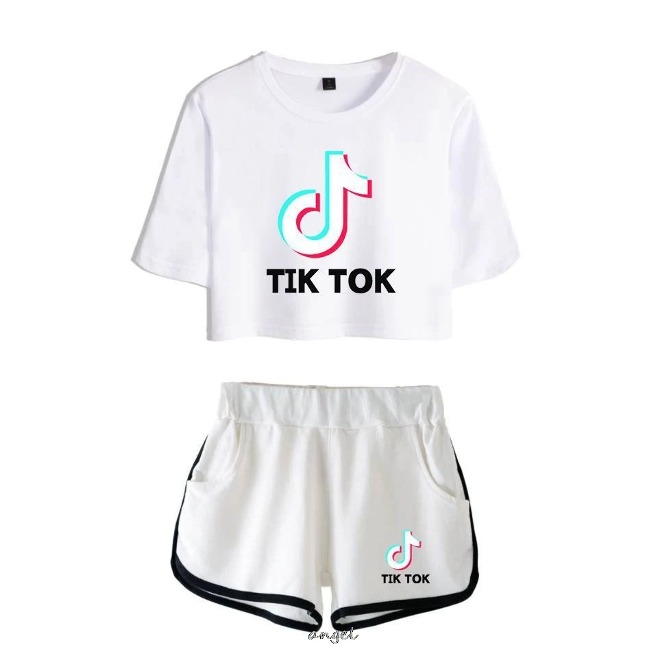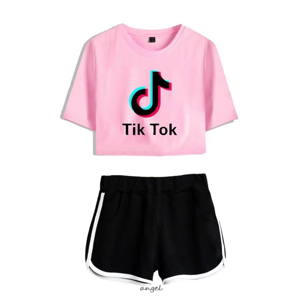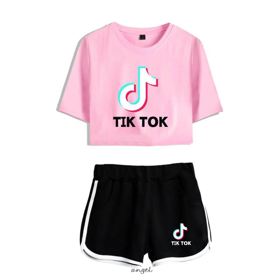 Tik Tok для женщин из двух частей комплект шорты + Милая футболка лучшая сейчас Tik Tok Харадзюку уличная одежда Лидер продаж, комплекты для девочек модные вечерние