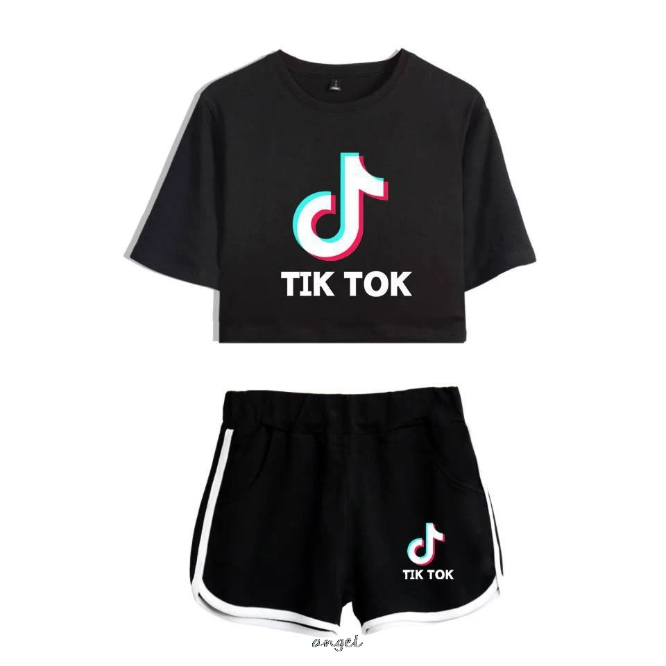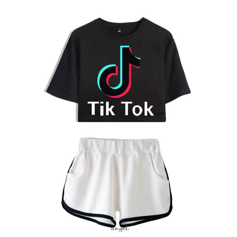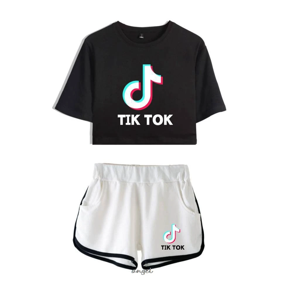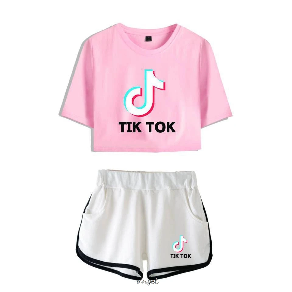 Tik Tok для женщин из двух частей комплект шорты + Милая футболка лучшая сейчас Tik Tok Харадзюку уличная одежда Лидер продаж, комплекты для девочек модные вечерние