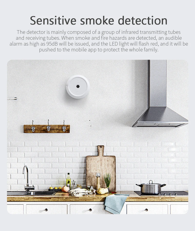 При обнаружении дыма и пожара, звуковой сигнал до 95 дБ будет издан с красным миганием светодиода и отправлен в мобильное приложение для защиты безопасности всей семьи.