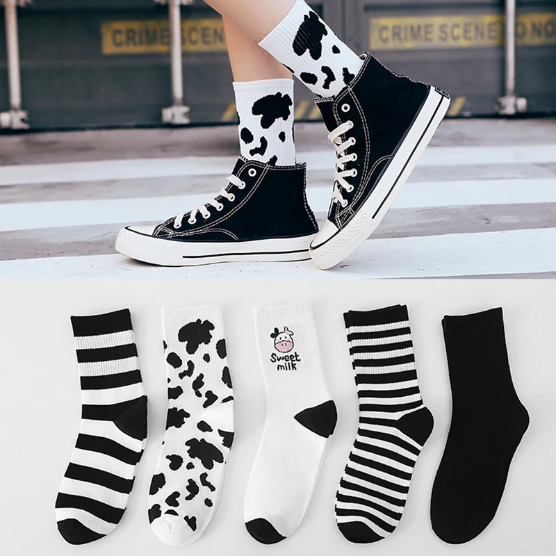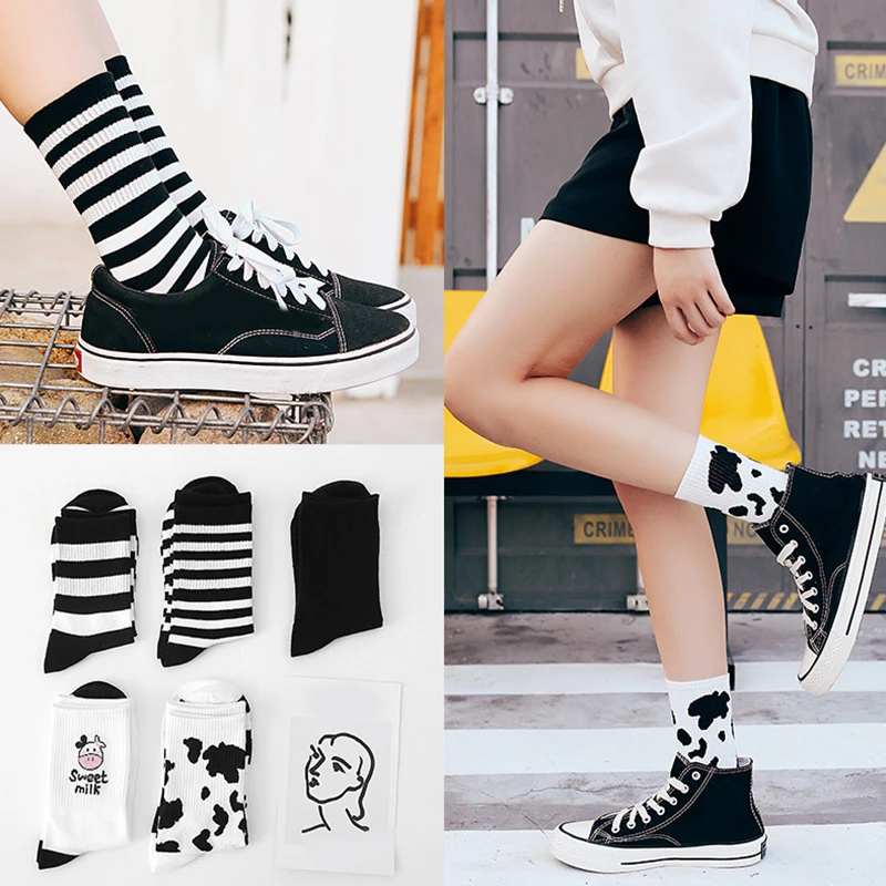 Ретро черный, белый цвет принтом в виде молочной бутылки носки персональный в черную полоску с надписью спортивные длинные чулки милые женские носки Харадзюку, повседневные носки с изображением персонажей мультфильма