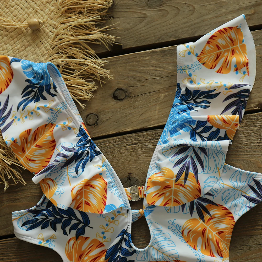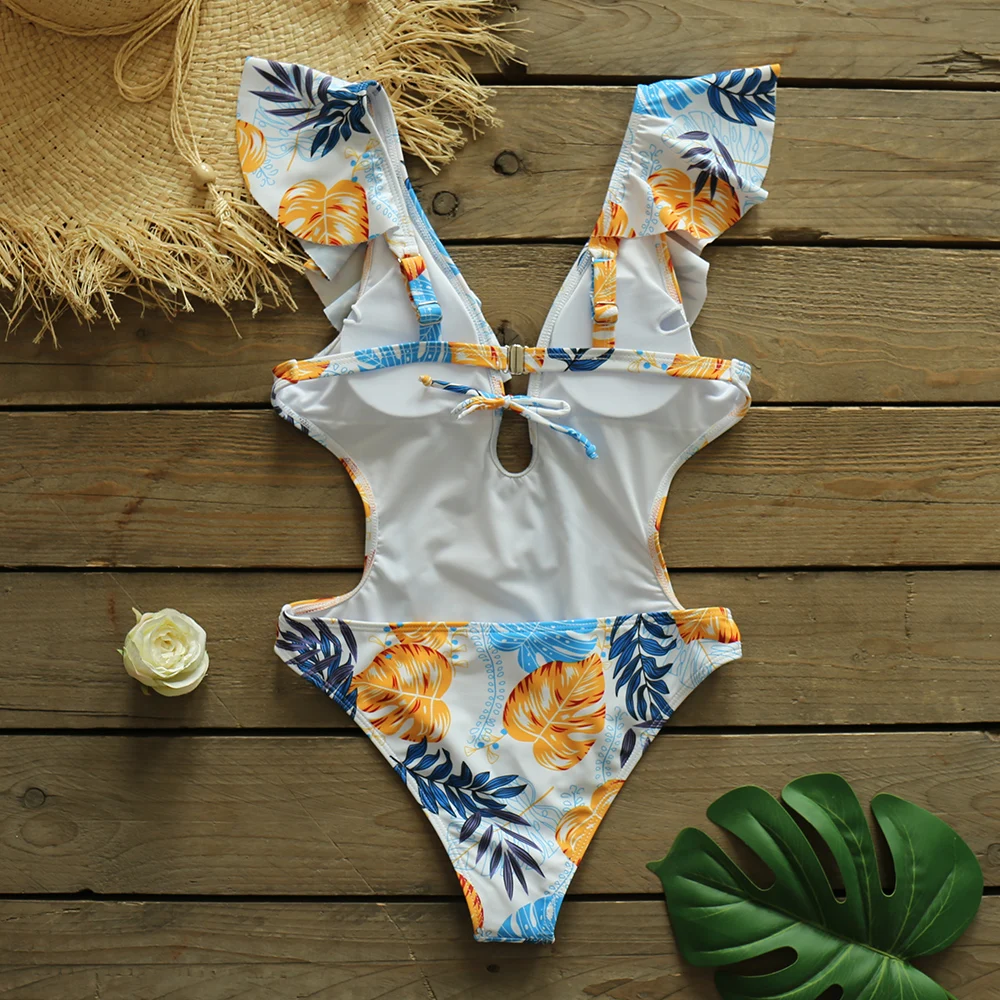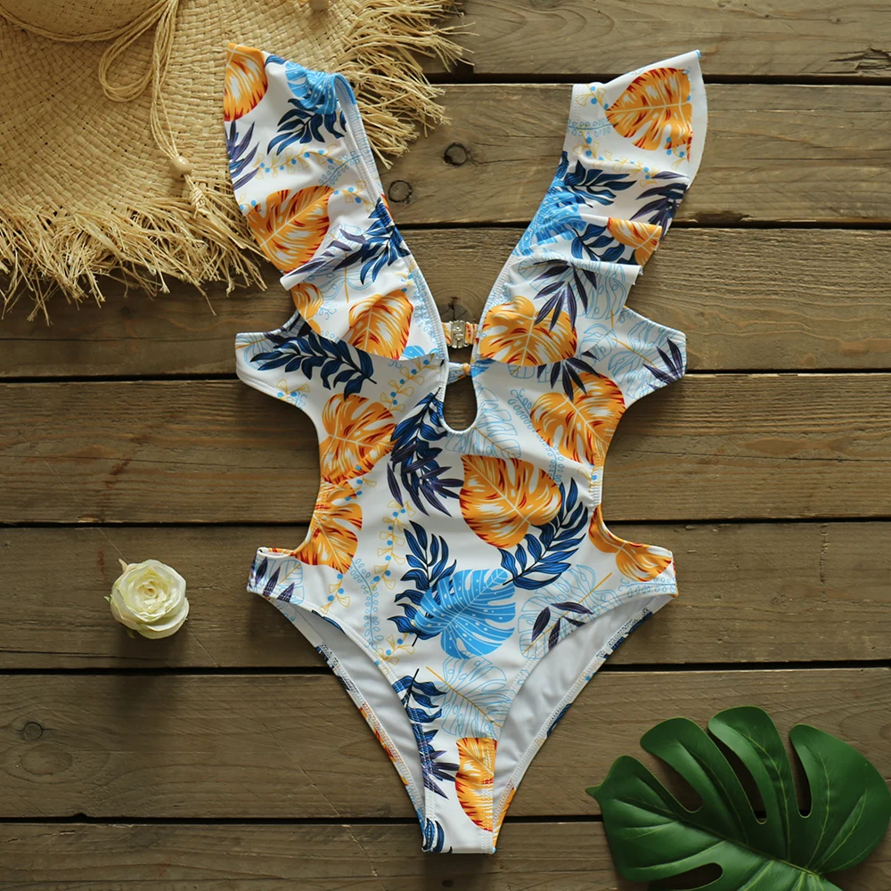 2021 новый сексуальный слитный купальник с цветочным принтом и оборками, купальник на бретельках, женский купальный костюм с глубоким V-образным вырезом и открытой спиной, пляжная одежда, монокини
