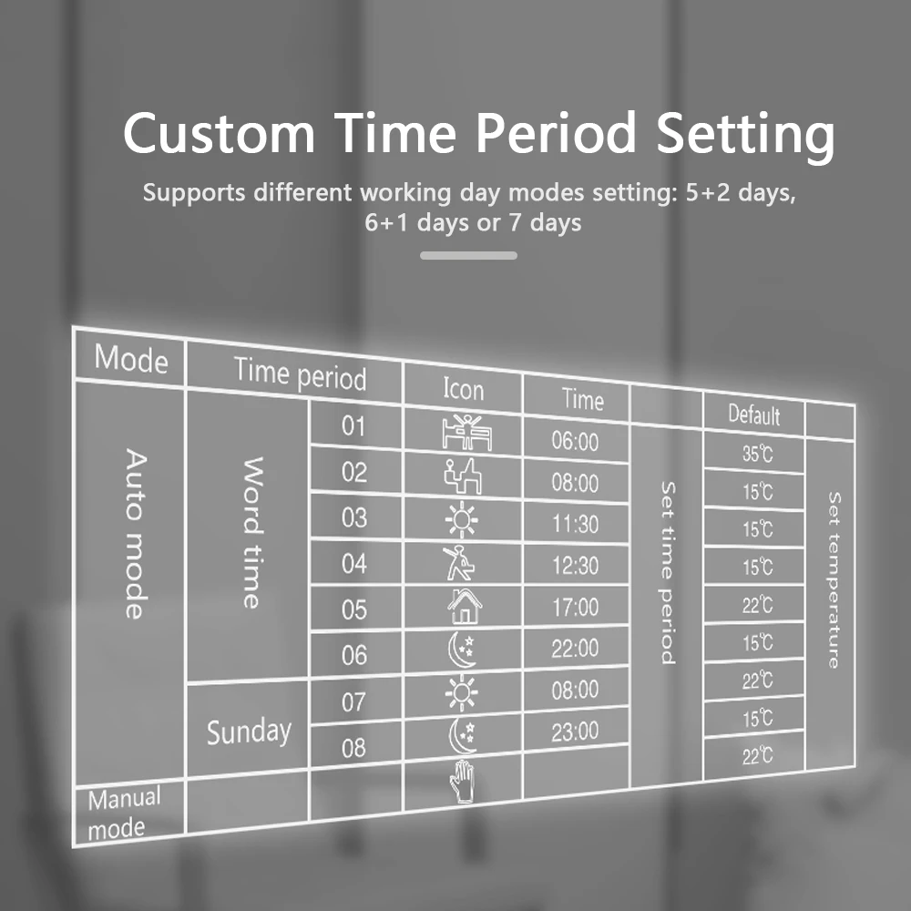 Термостат поддерживает различные режимы рабочего дня: 5 + 2 дня, 6 + 1 дней или 7 дней.