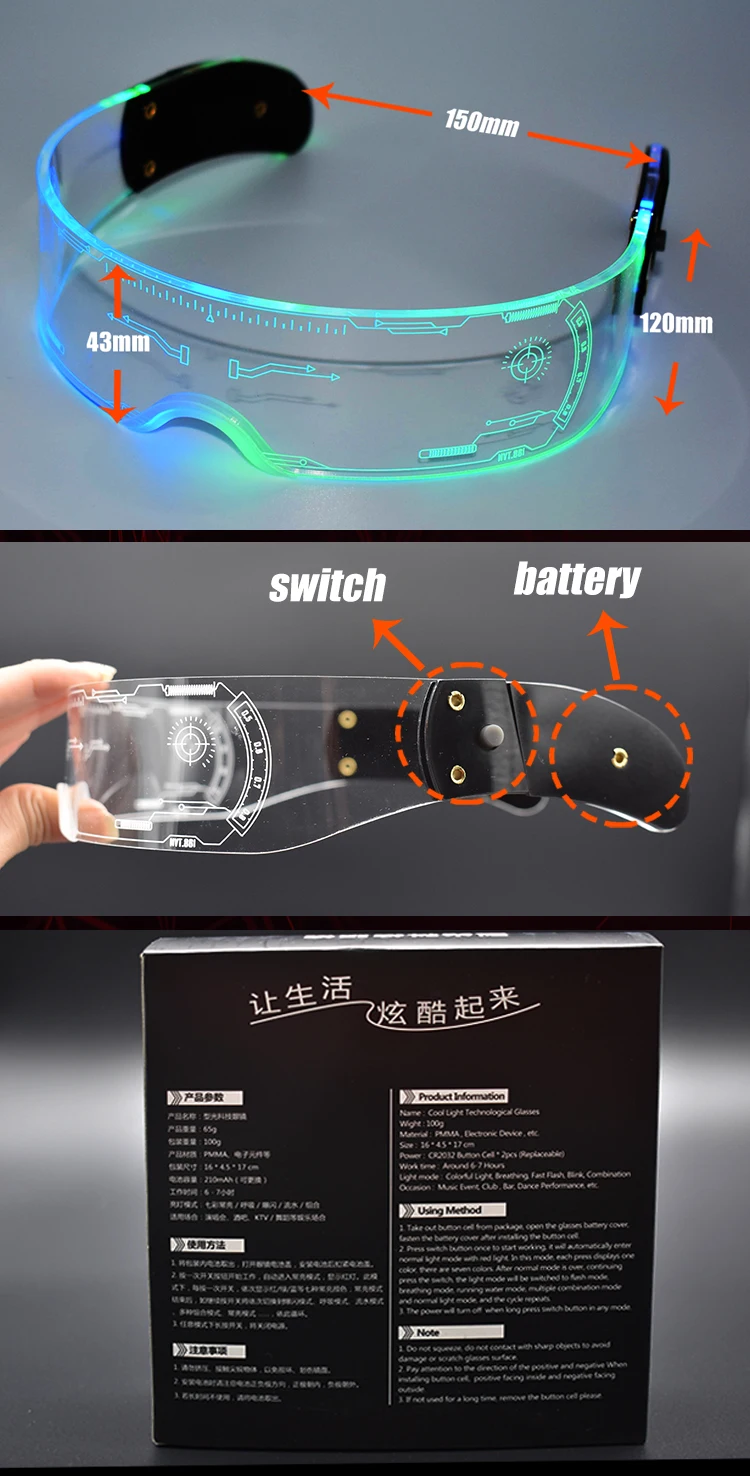1. Обратите внимание: это, безусловно, привлекательные очки, которые привлекут внимание на события, вечерние, карнавал или клуб.2. Прочные материалы: высококачественные материалы для устойчивости к царапинам и высокой устойчивости к поломке. Использует беспроводной и бесшумный светодиодный технологии.3. Комфорт при ношении: при проектировании очков мы сделали комфорт при ношении приоритетным. Дополнительная подкладка линз и формованные носоупоры делают вас комфортными.4. Два светодиода на каждой руке: расположение двух светодиодов на каждой руке делает ее идеальной поддержкой внешнего вида cyberpunk. Они излучают светильник от объектива.5. Подходит для всех случаев: используется для ролевых игр, вечеринок и всех случаев.
