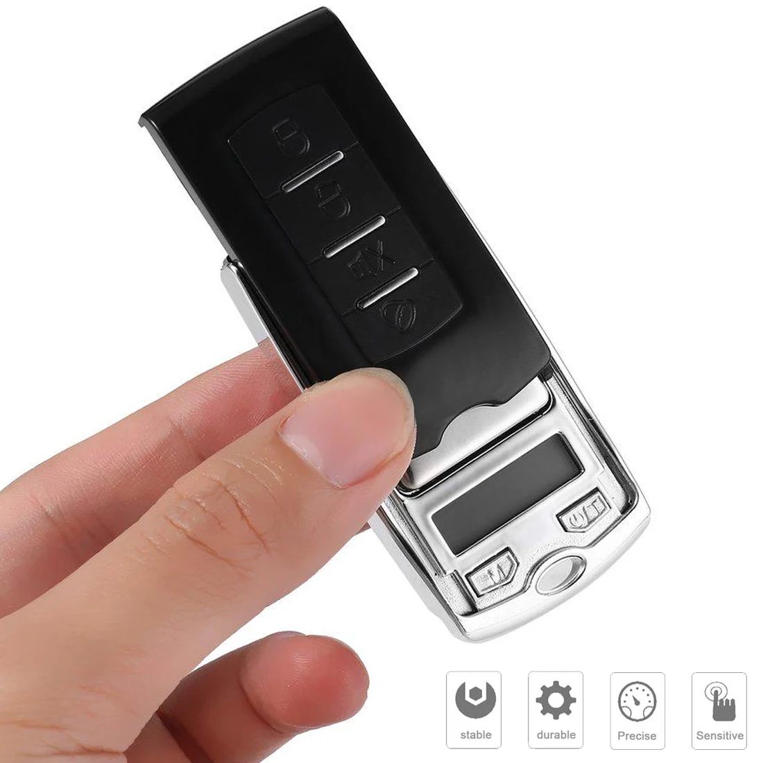 Такой маленький. Отлично работает. Вот подсказка, чтобы открыть его: он предназначен для того, чтобы выглядеть как электронный ключ для автомобиля. Вы увидите, что выглядит как 4 прямоугольные кнопки на какой крышке весы. Я использую их для небольшой тяги, чтобы нажать/свернуть черную крышку. Отжимайте/сползайте от отверстия для брелока. Легко.