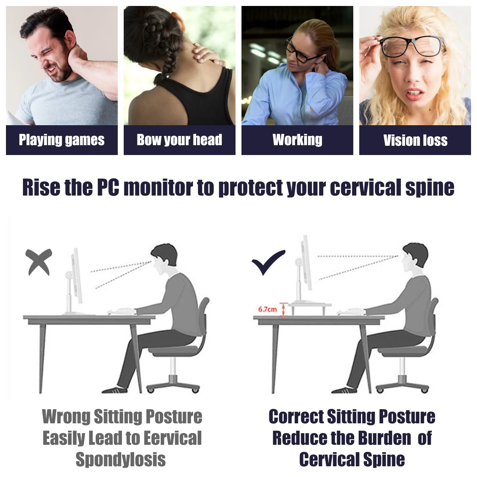 Подставка для монитора компьютера:Поднимите монитор вашего компьютера, вы можете смотреть монитор вашего ПК более комфортно, Защитите глаза и шейные позвонки, избавьте ваше тело от усталости или болезненности после долгих рабочих часов.
