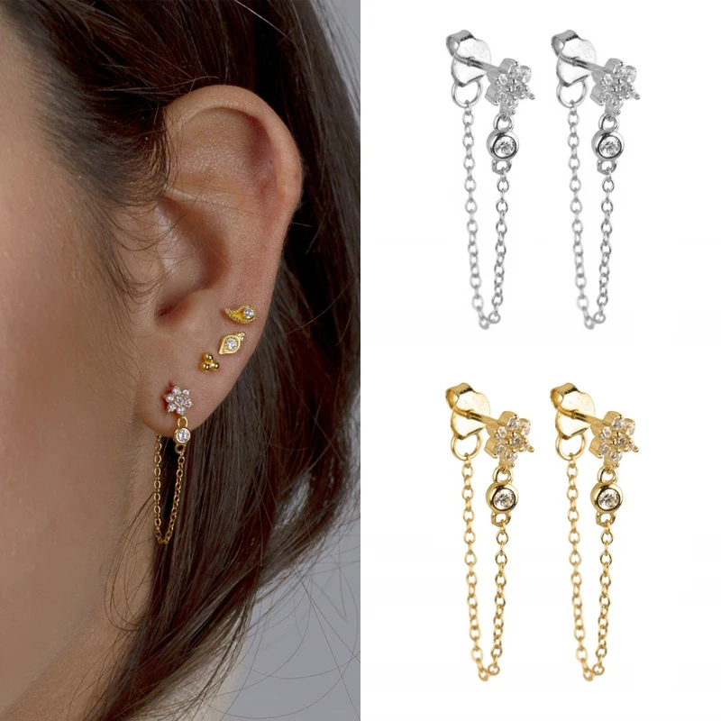 ISUEVA блестящее Серебро золотое покрытие с кисточками пирсинг уха кубический циркон в форме цветка на цепочке, серьги-гвоздики для женщин подарок ювелирные изделия
