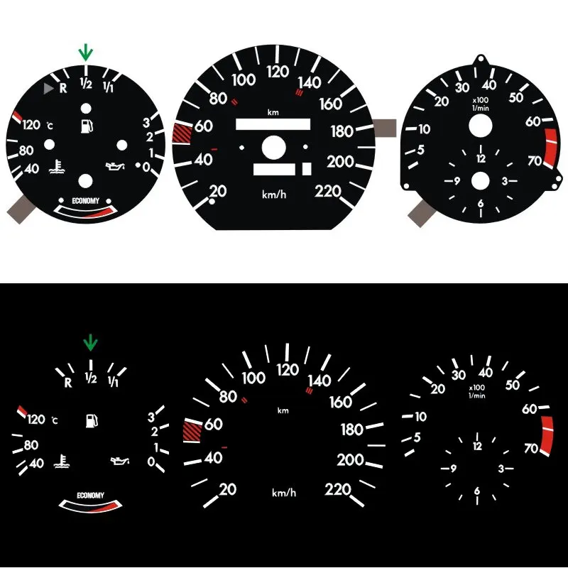 Совместимость: W201 (190E) -Пожалуйста, обрежьте нижнюю часть спидометра примерно 7 мм, чтобы соответствовать размеру.