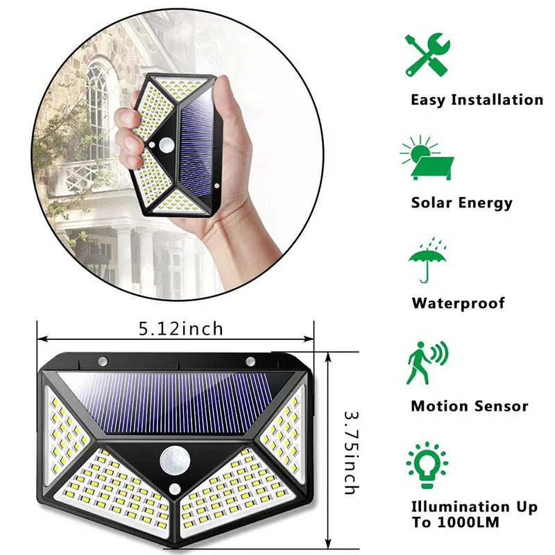 100LED Солнечный водонепроницаемый четырехсторонний индукционный настенный светильник для человеческого тела подходит для использования на открытом воздухе, таких как коридоры, садовые ворота, крыши, внутренние стены, виллы, витрины, магазины, дома, И т. Д., Нет проводки, нет электричества, изысканное мастерство и уникальный вкус.