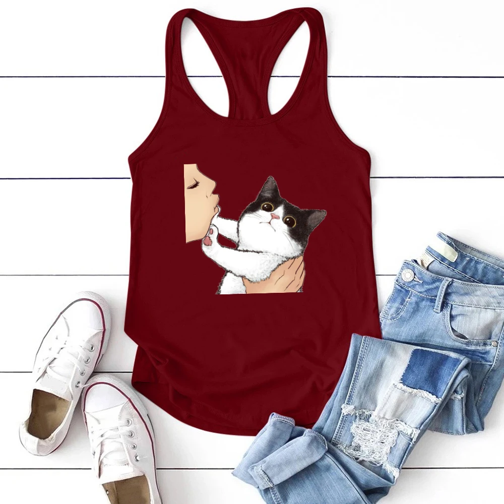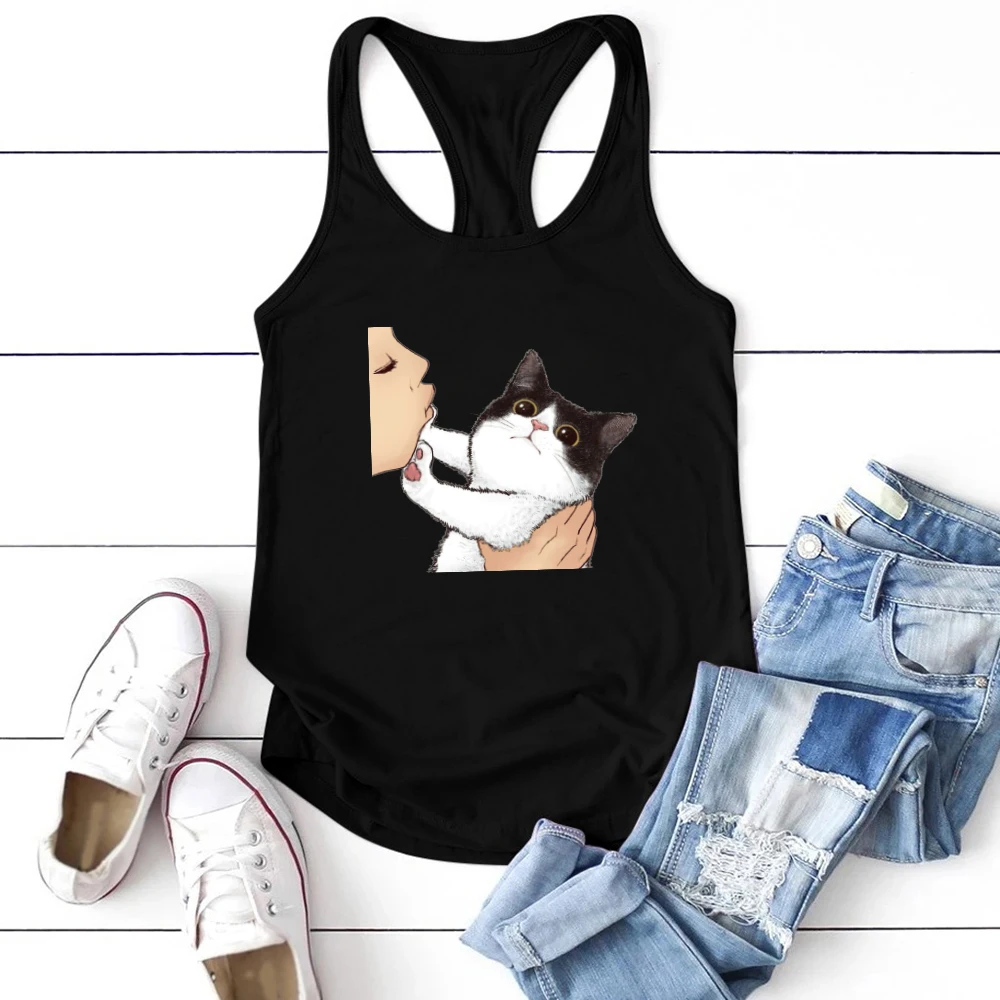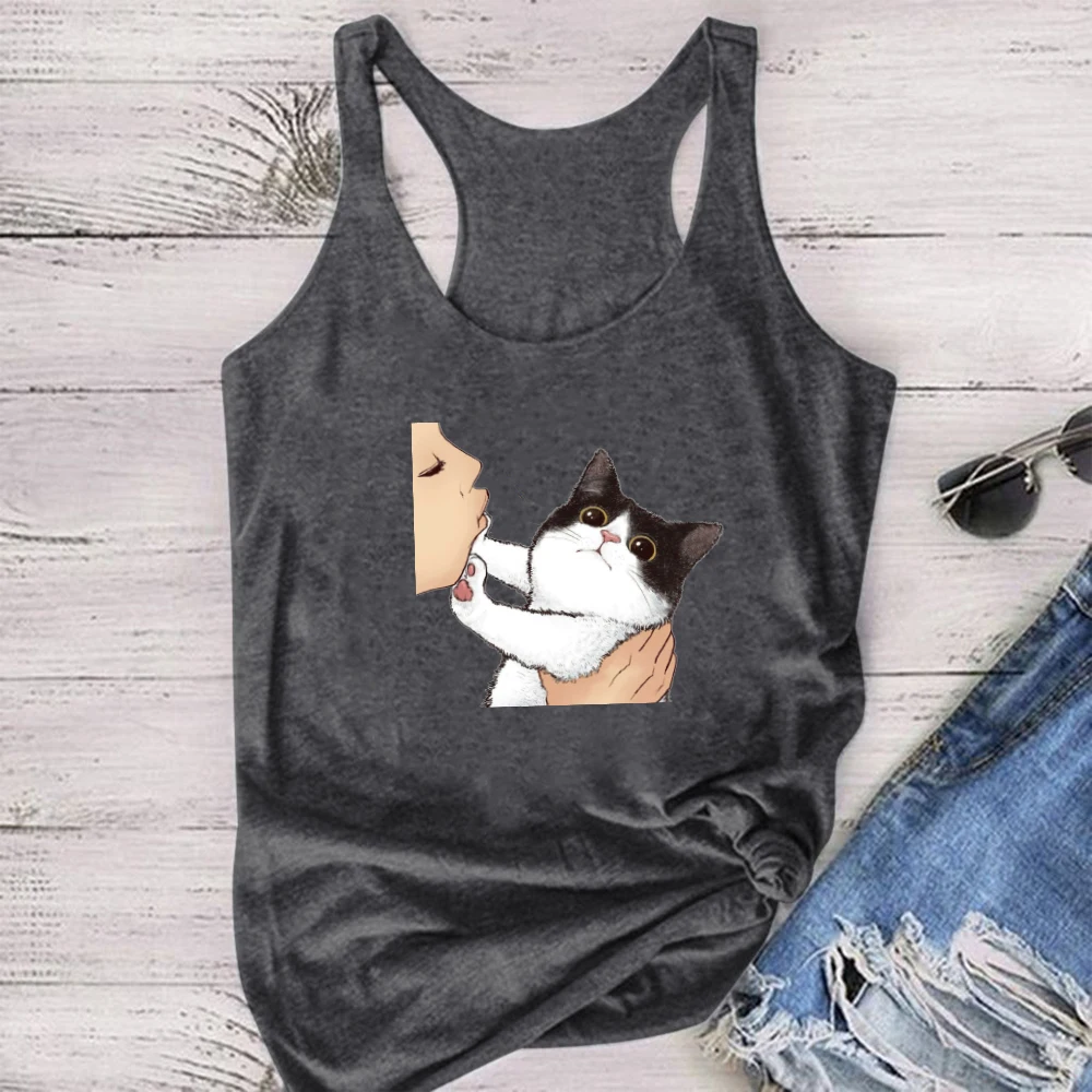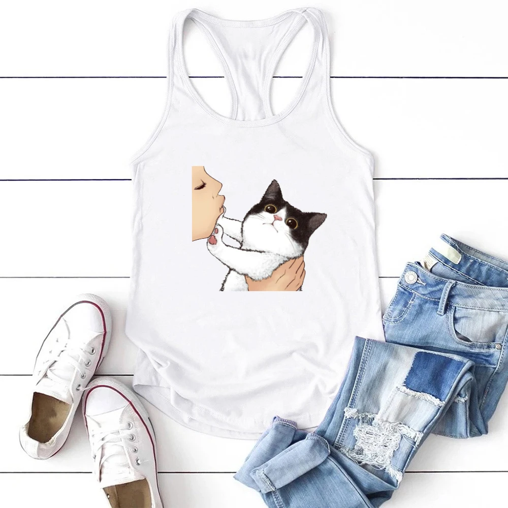 Забавный кот печатных женские топы на бретельках без рукавов и с круглым вырезом, летняя свободная футболка для женщин размера плюс 90s женские жилет Повседневная рубашка