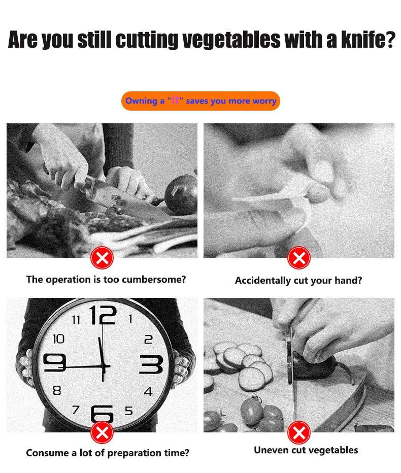 Вы все еще рубите овощи вручную? Если вы чувствуете усталость из-за частых операций, случайно разрезая пальцы, это займет не только много времени, порезные блюда также будут отличаться по размеру. Да ладно, мой дорогой друг, у меня есть такой «it», который позволяет легко резать овощи, быстро и без усилий, И дизайн «Три в одном» позволяет безопасно брать домой и беспокоиться!