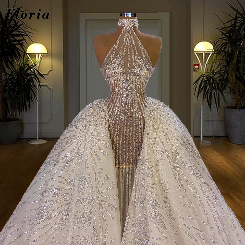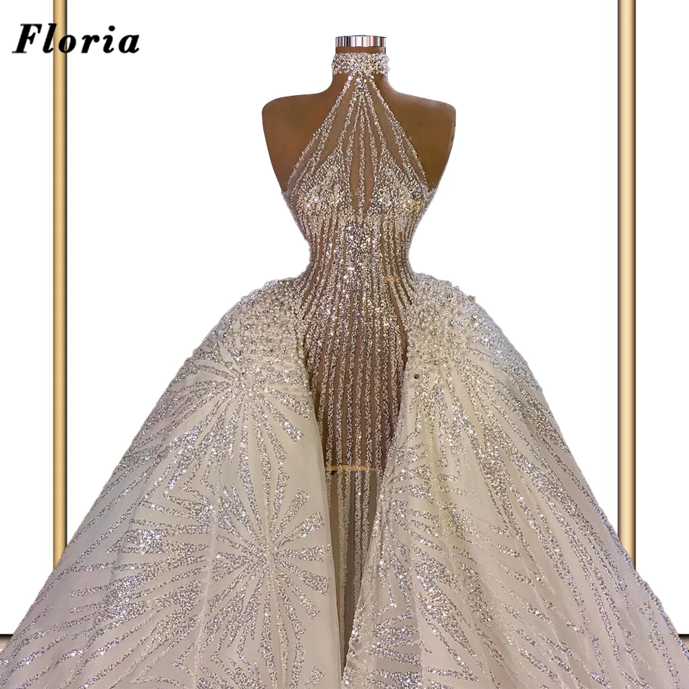 Пикантные с лямкой на шее, расшитые блестками, на свадьбу для девочек платья 2021 Haute Couture Бисер Свадебные платья индивидуальный заказ длинное свадебное платье Vestido De Noiva