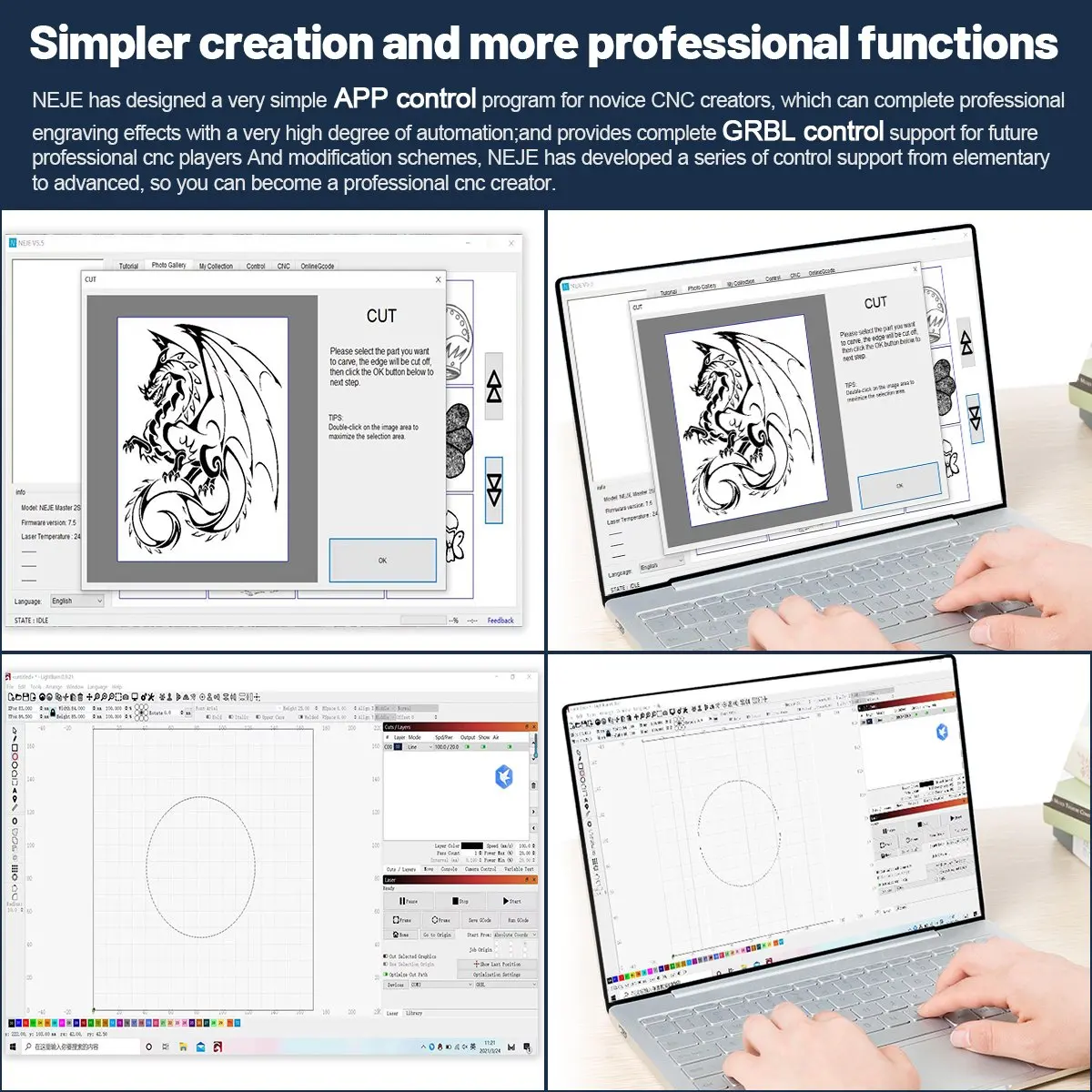 * Программное обеспечение NEJE (бесплатное программное обеспечение) поддерживает windows 7, 8, 10. Mac OS. Приложение NEJE, в том числе android, iOS macOS, NEJE команда развивает его, который предназначен для начинающих, он может обеспечить высокоточную резку и программное обеспечение для создания CNC, рабочие процедуры являются автоматическими и простыми, безопасными. Особенно текущее программное обеспечение гравировки, команда NEJE продолжает обновлять и оптимизацию, также предоставляет бесплатные услуги по обновлению, вы можете получить бесплатные услуги по обновлению в вики.nejetool.com