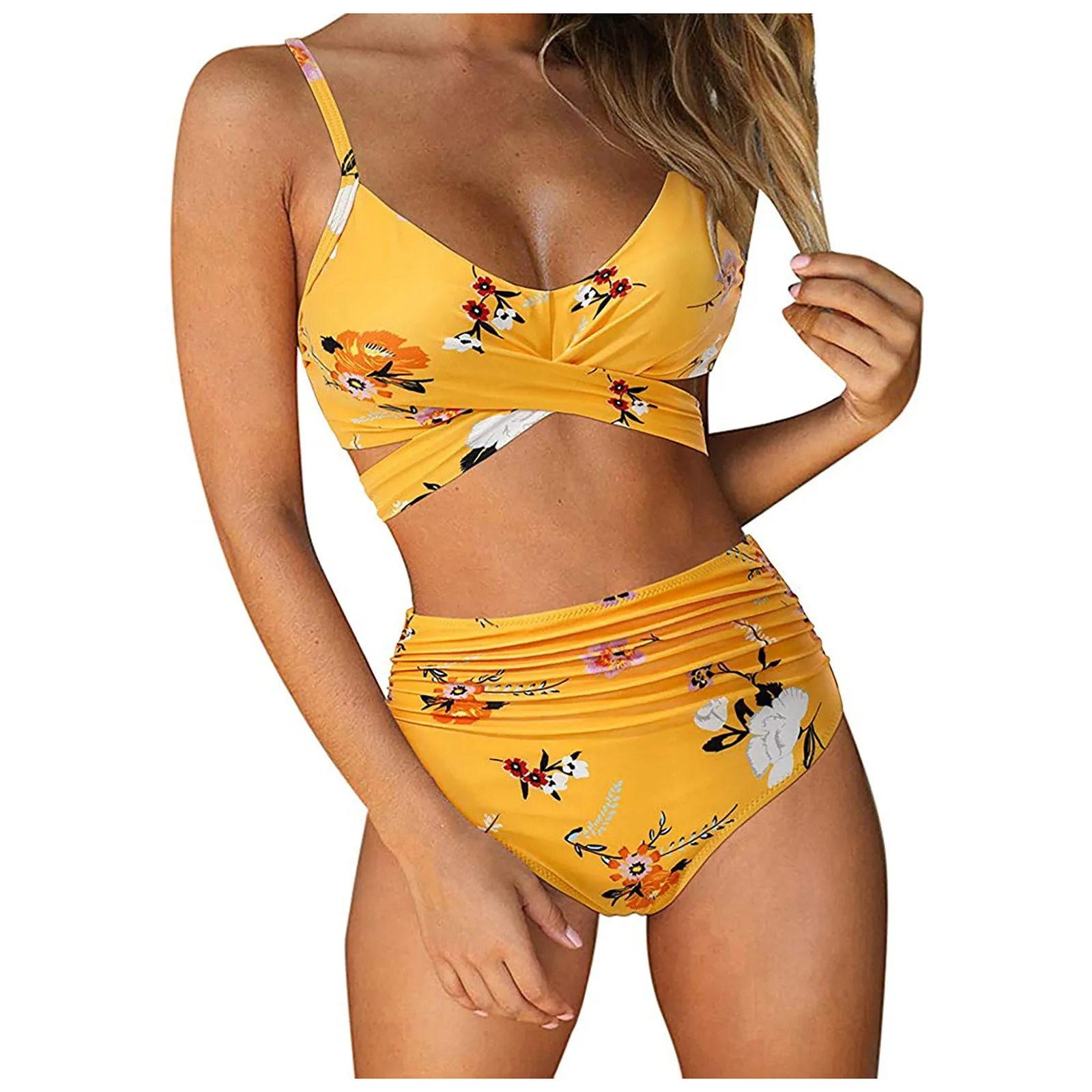Комплект бикини из 2 предметов с раздельным цветочным принтом, комплект бикини с высокой талией, женский купальник, шорты, однотонные бразильские трусики бикини