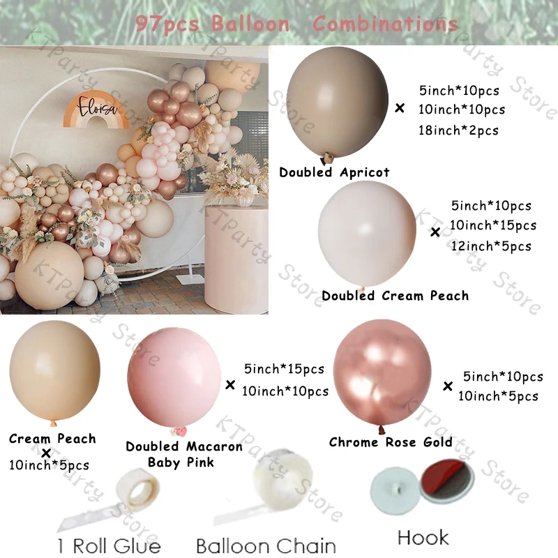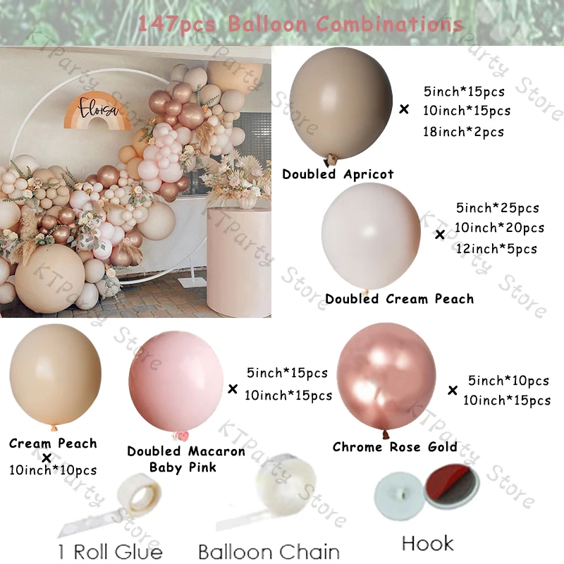 147 шт (14 футов) шар гирлянда Арка Упаковочный лист:Розовый (5 дюймов * 15 шт., 10 дюймов * 15 шт.)Абрикосовый (5 дюймов * 15 шт., 10 дюймов * 15 шт., 18 дюймов * 2 шт.)Крем-персик в два раза (5 дюймов * 25 шт., 10 дюймов * 20 шт., 12 дюймов * 5 шт.)Хромовое розовое золото (5 дюймов * 10 шт., 10 дюймов * 15 шт.)Крем персиковый 10 дюймов * 10 штБесплатно: рулонный клей * 1(100 шт)Воздушная цепь * 1(5 м)Крючок * 3