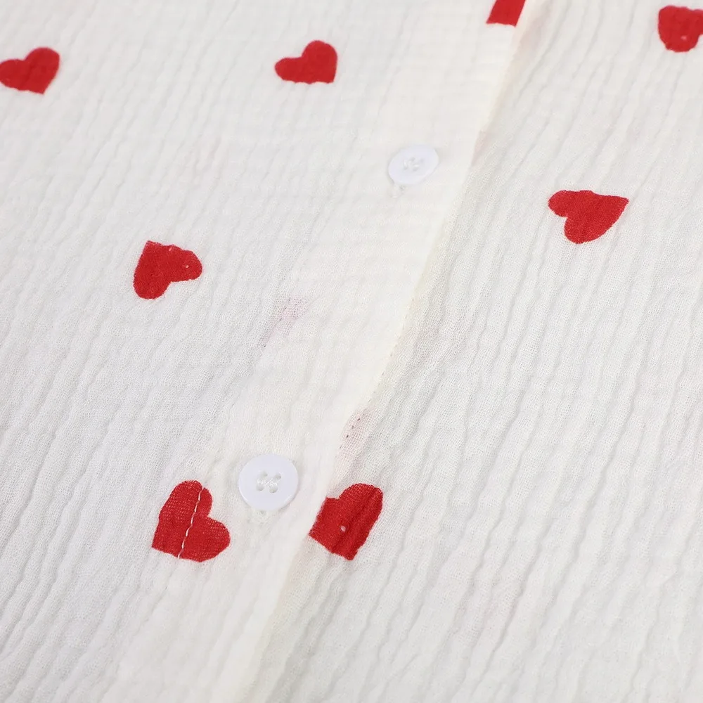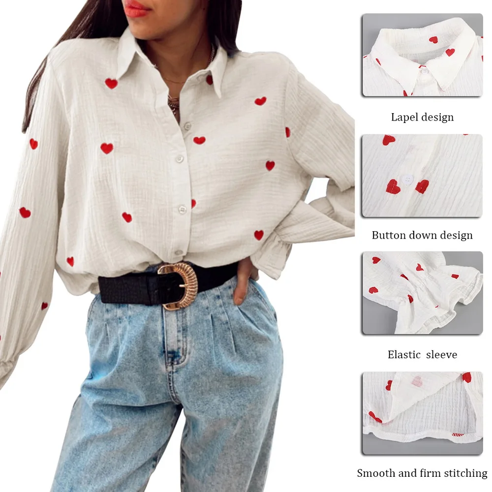 Turn Down Collar BlousesRed Heart Print Embroidery Shirts