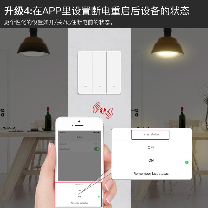 2. Новая идея для цепи 2/3 (два переключателя управляют один светильник), которая объяснена как многоуправляемая связь этого переключателя с другими смарт-переключателями в приложении; включение/выключение статуса реле, как помните последний Статус, когда выключение питания и задний светильник, Настройка в приложении Smart Life для лучшего сна ночью; Емкостное сенсорное управление, Включите/выключите светильник одним касанием и устойчивостью к царапинам стеклянная панель дает лучший вид, чтобы сочетаться с любым дизайном стены. (Примечание: Вы можете управлять несколькими связями этого переключателя с несколькими различными переключателями, но несколько банд на одном коммутаторе недоступны, для мульти-контроля можно использовать только один переключатель.)