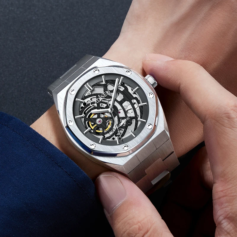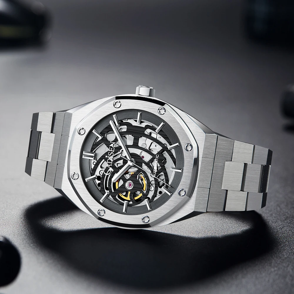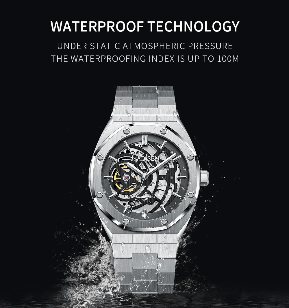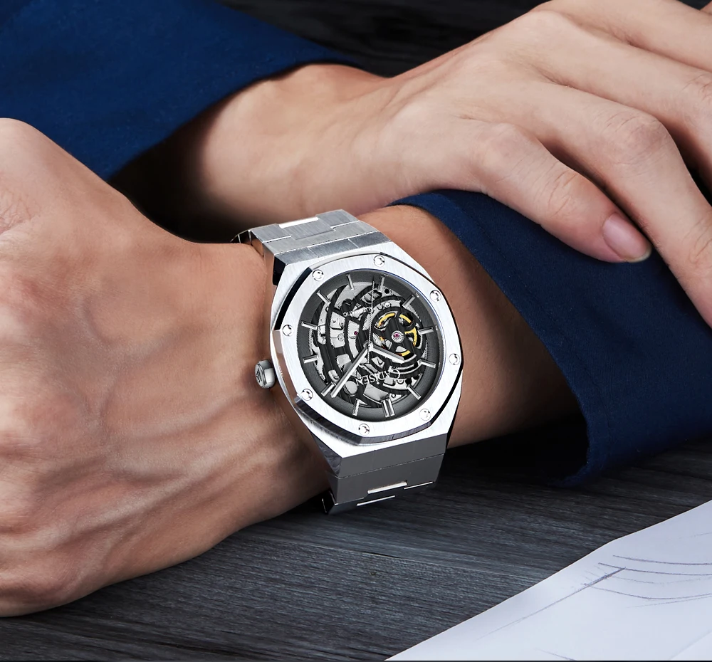 Мужские автоматические механические наручные часы-скелетоны с сапфировым стеклом, 100 м