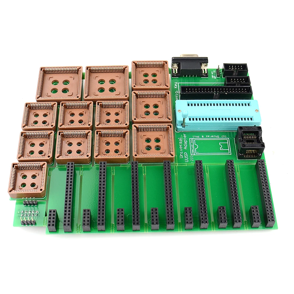 Новый УПА-usb-Полный комплект со всеми адаптерами, Основное устройство может быть напрямую подключено к Elrasoft.com UUSP (UPA-USB серийный программатор) или дополнительным удлинительным кабелем DB9 типа «Папа/мама» 1:1. Он оснащен 40-контактным разъемом ZIF для всех узких и широких устройств DIP / DIL, а также 16-контактным разъемом SOIC ZIF (150 мил, узким) для охвата наиболее часто используемых устройств.