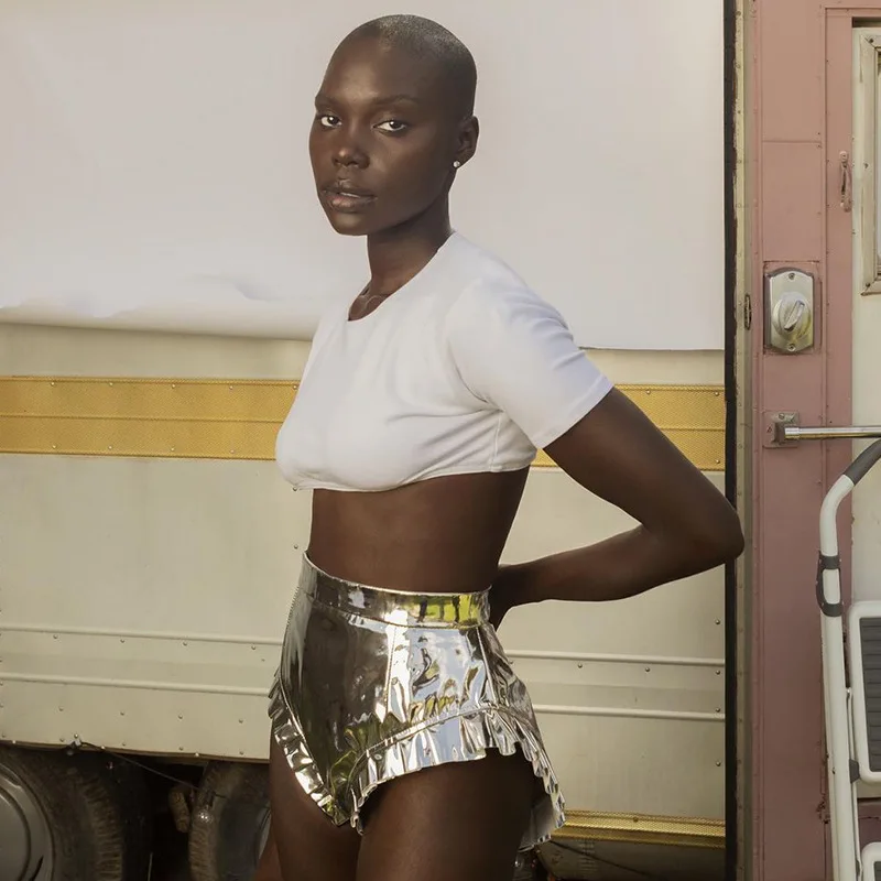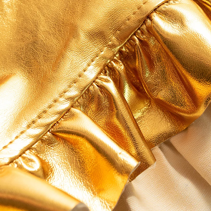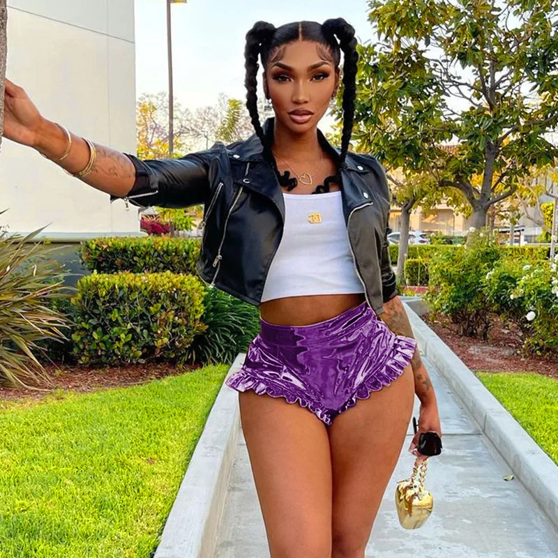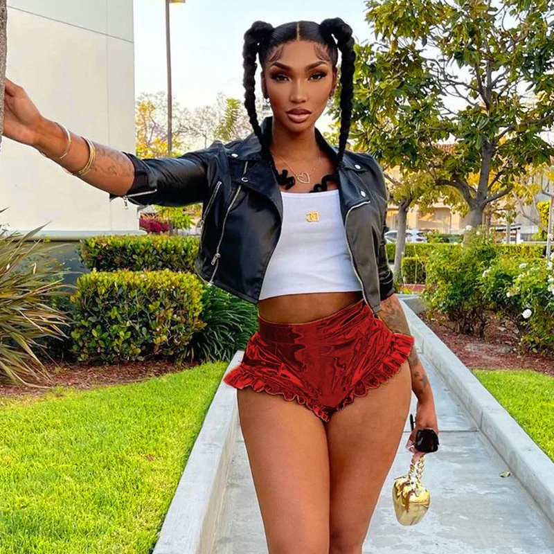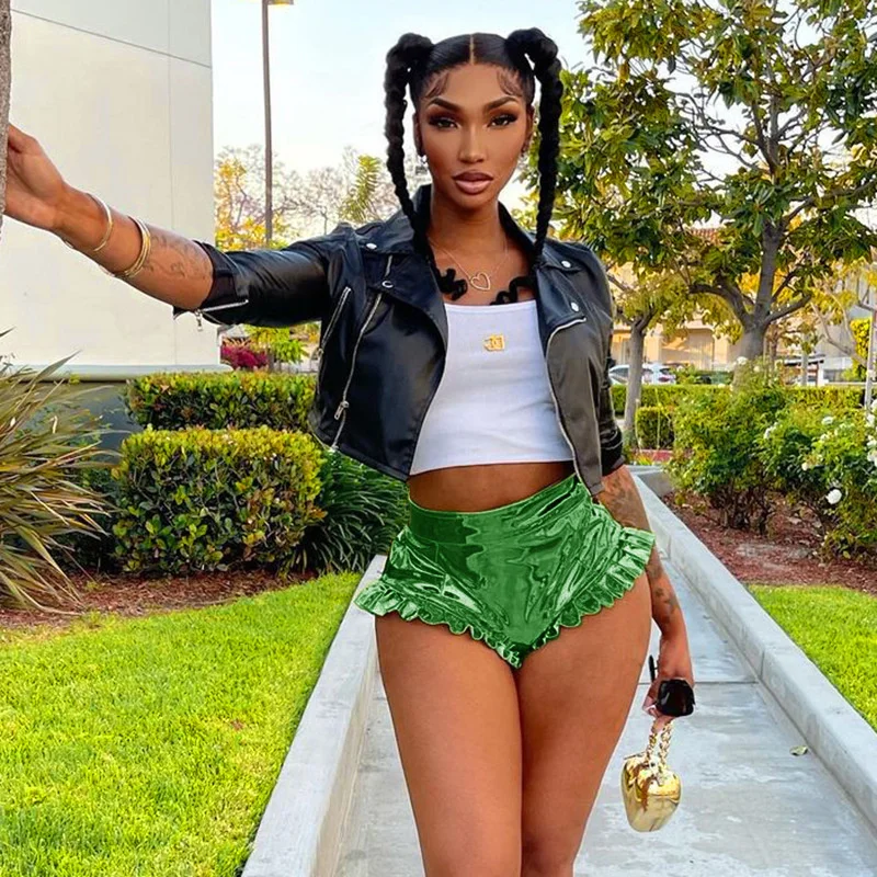 Женские однотонные туфли с Цвет блестящие шорты с металлическим отливом, летние, с завышенной талией, из PU искусственной кожи отделка рюшами Короткие штаны ЗолотойСеребряныйрозовыйкрасныйфиолетовыйзеленый