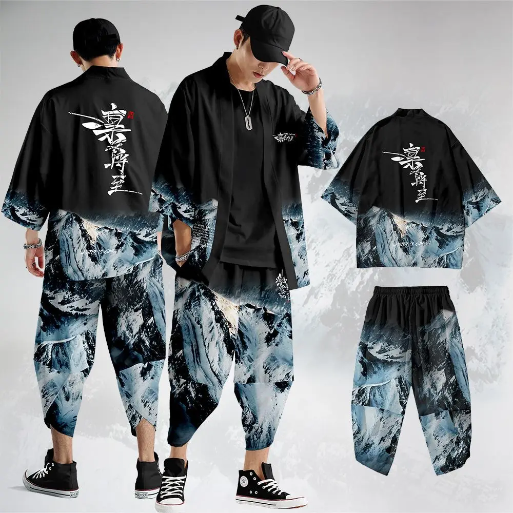 Мужской кардиган в стиле Харадзюку, кимоно с японским черным принтом, одежда и брюки, Пляжное пальто, кимоно в японском стиле, уличная одежда хаори