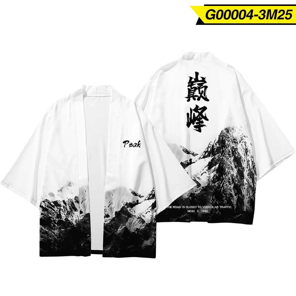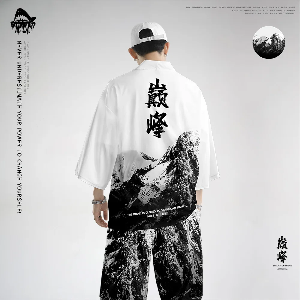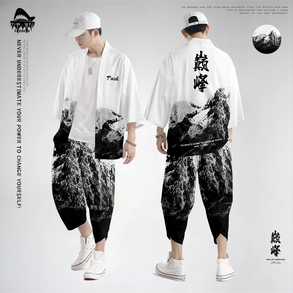 Кимоно мужское в китайском стиле, свободное кимоно с белым принтом, хаори юката, модная повседневная крутая уличная одежда и брюки для косплея, на лето