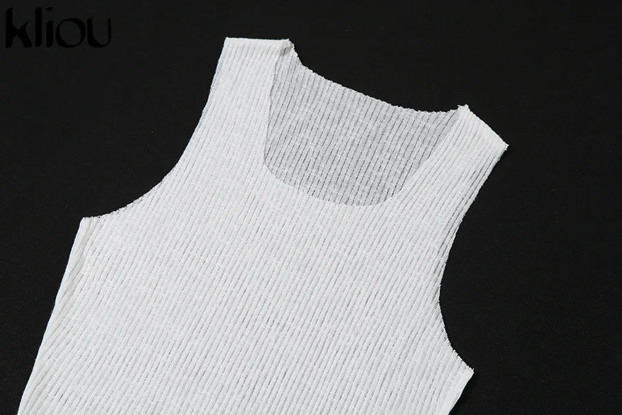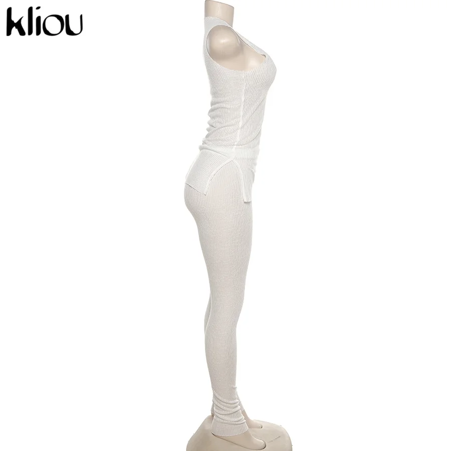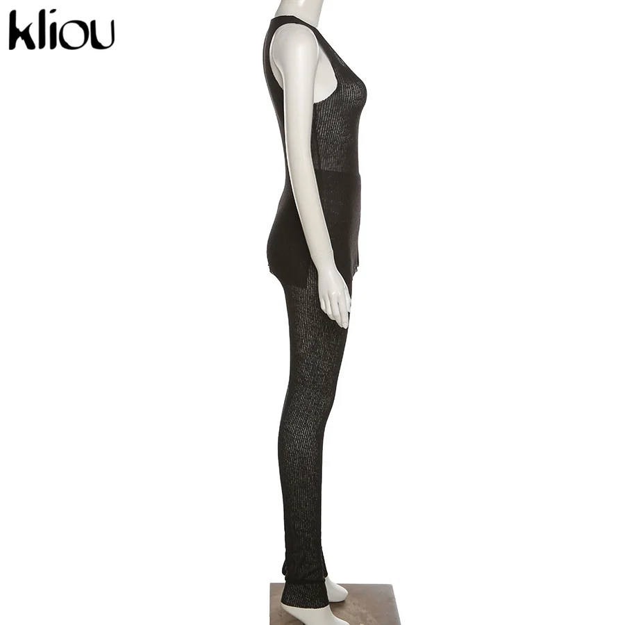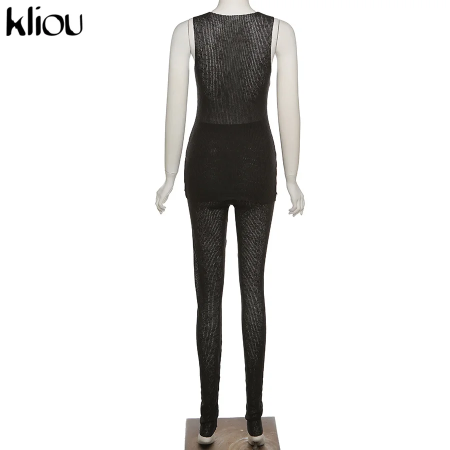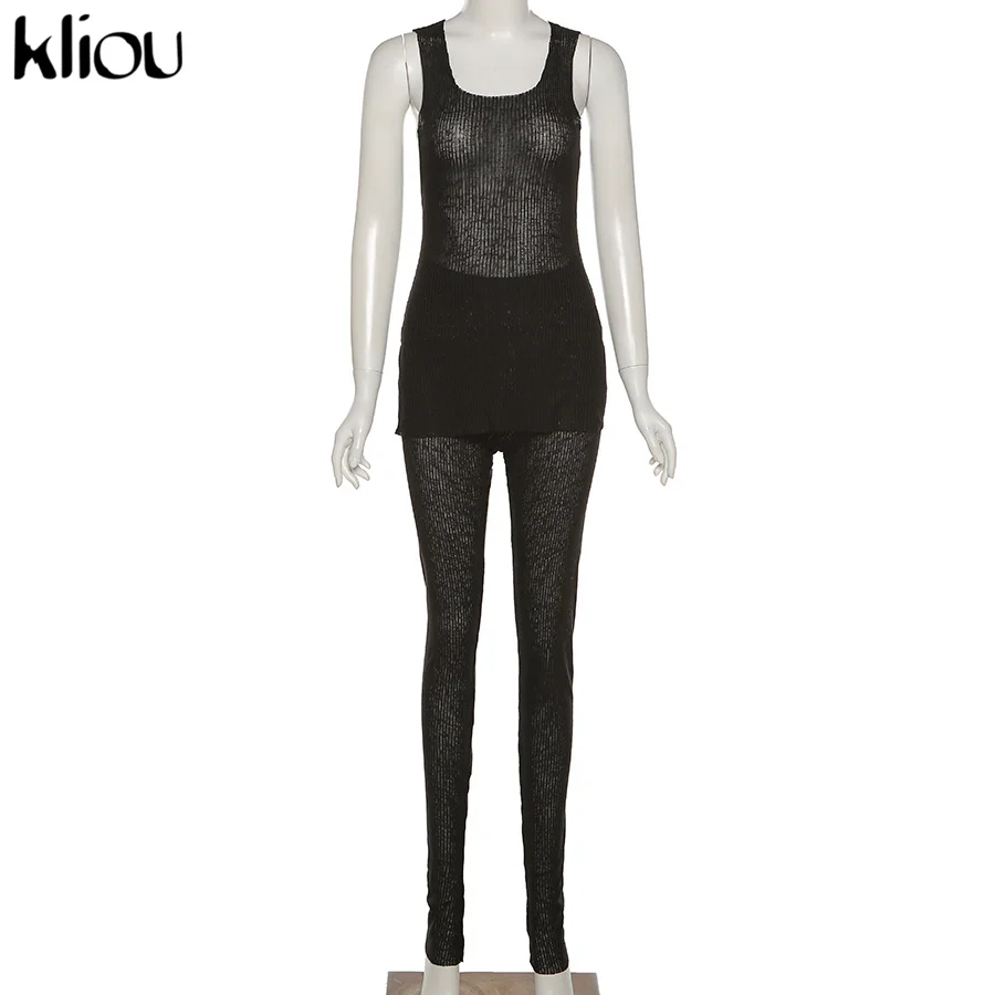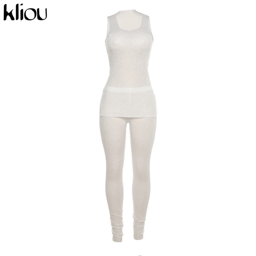 Kliouоднотонный вязаный комплект из двух предметов, женский прозрачный облегающий Повседневный Топ + штаны, одинаковые комплекты, пикантная одежда для активного отдыха в уличном стиле