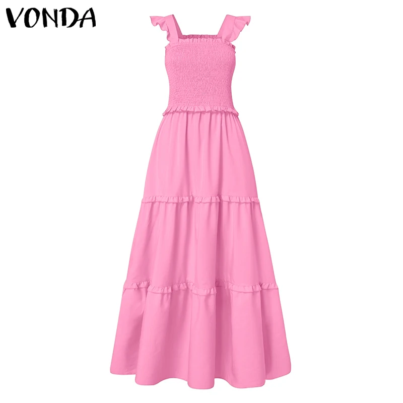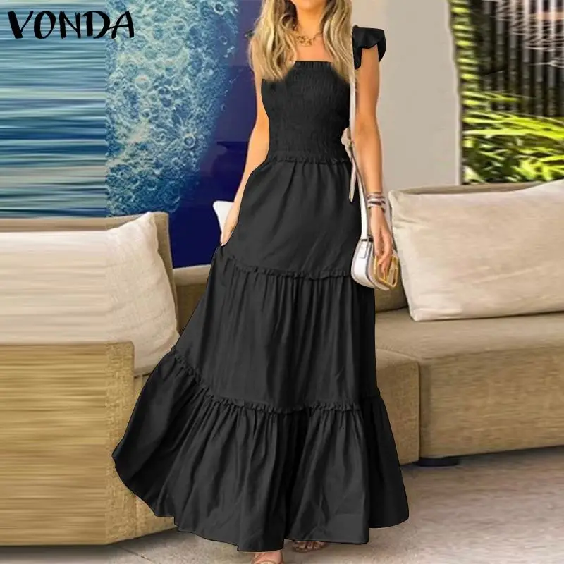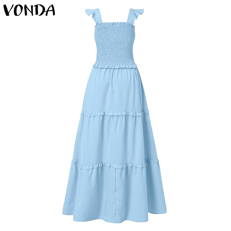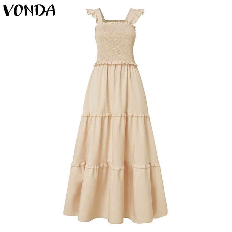 Женское длинное платье с оборками VONDA, повседневное однотонное кружевное Плиссированное праздничное платье макси без рукавов, лето 2021