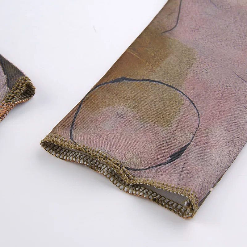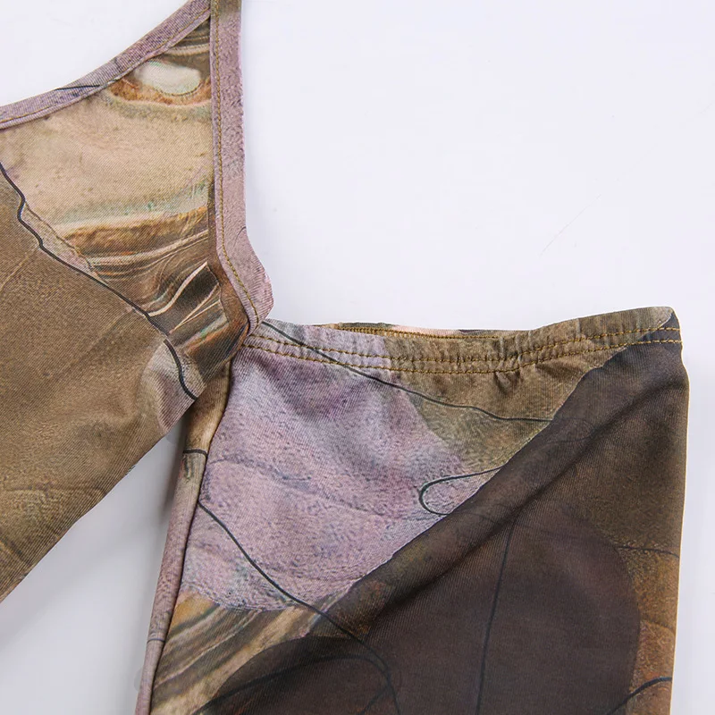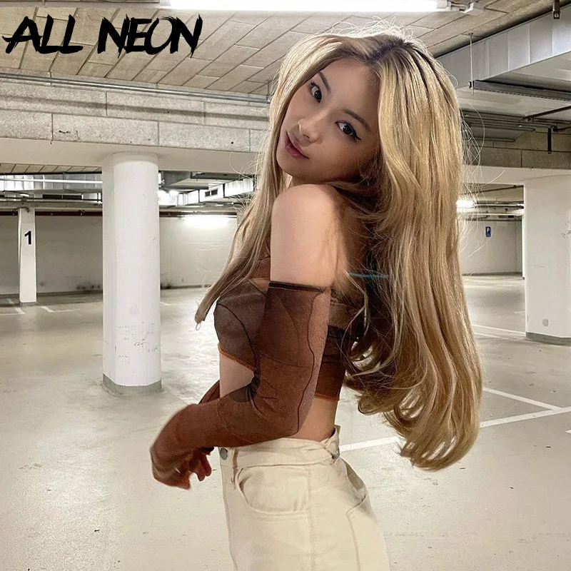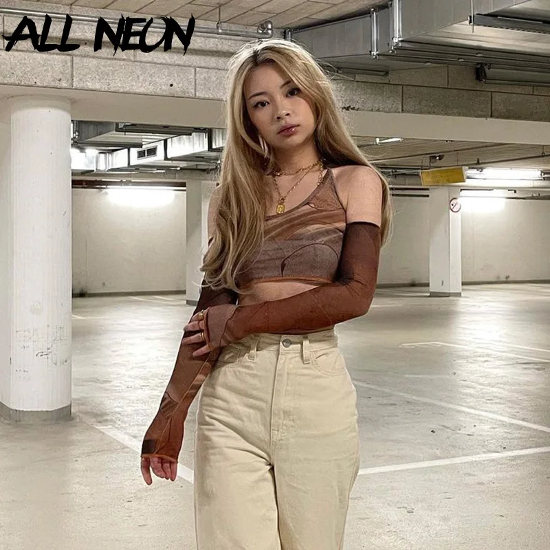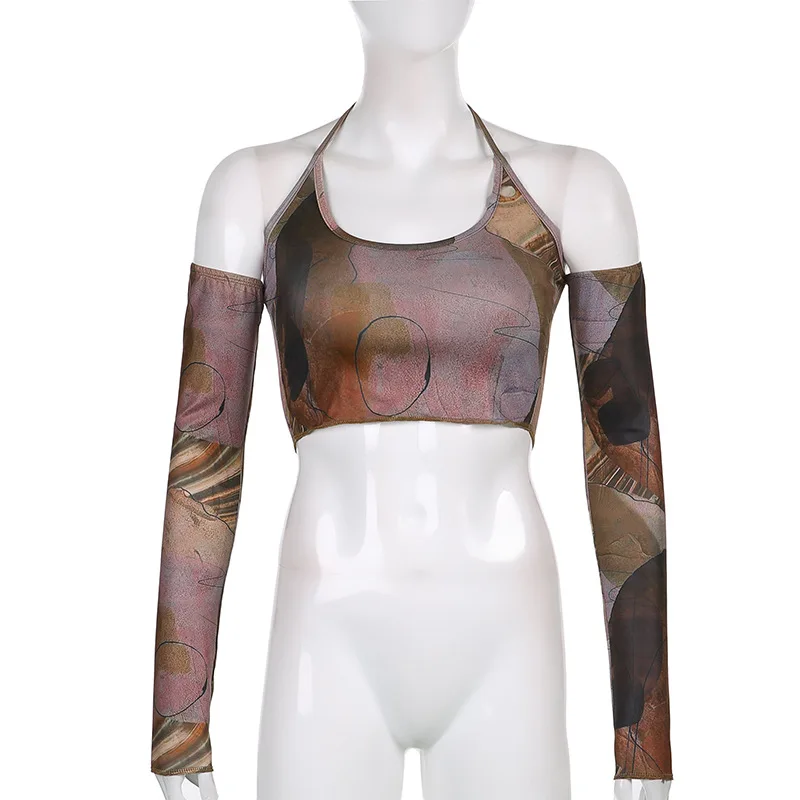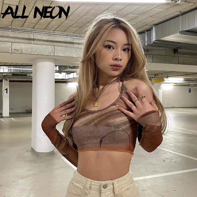 ALLNeon, винтажная уличная одежда 90-х годов, художественный принт, короткий топ с открытой спиной, модные ретро топы с открытыми плечами и лямкой на шее, с рукавом, Новинка