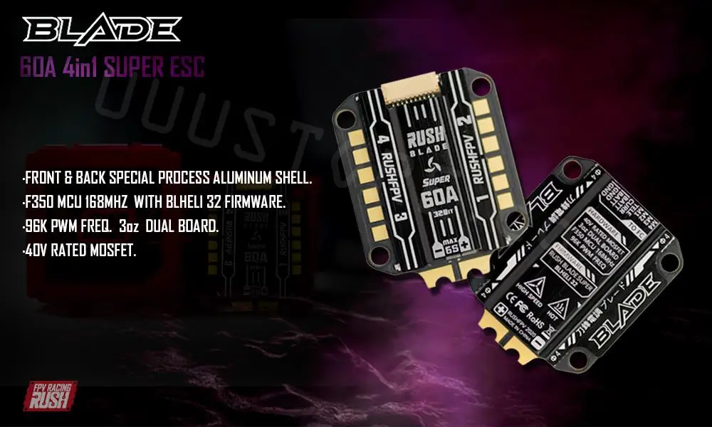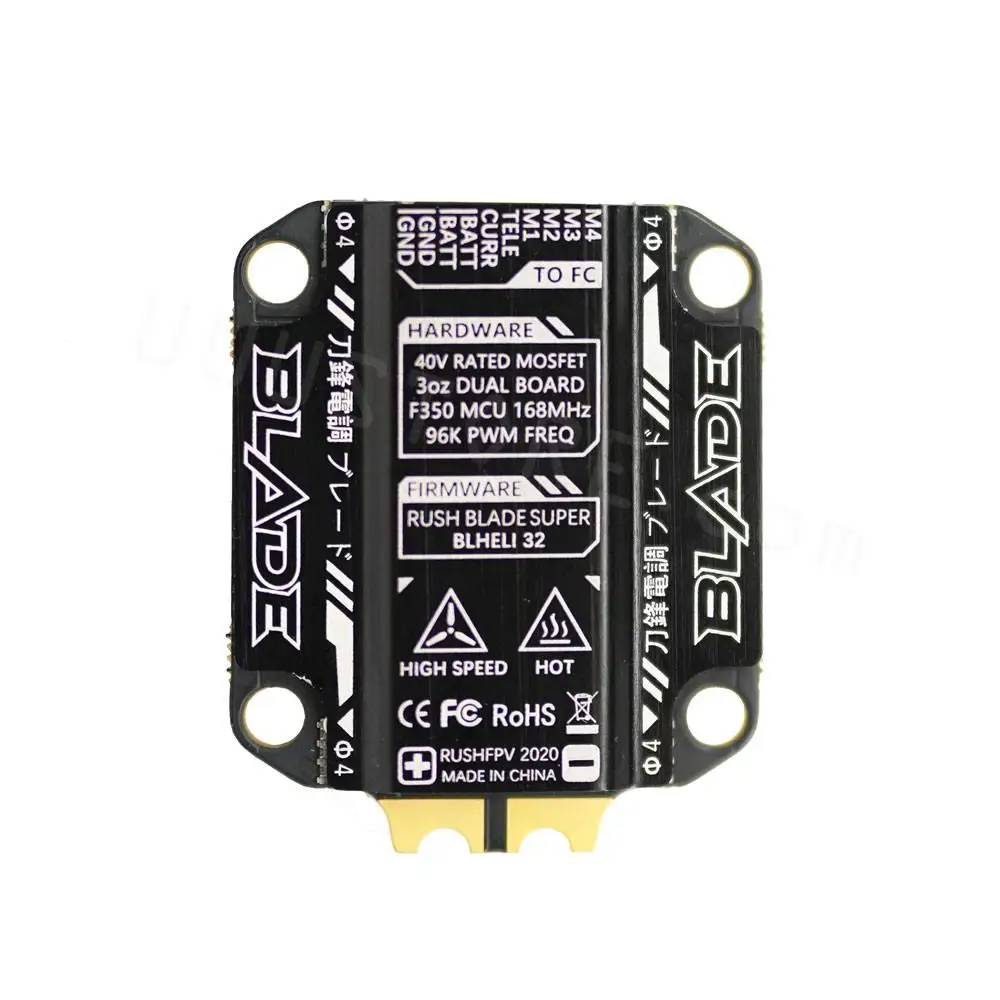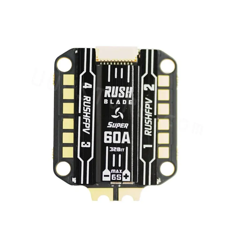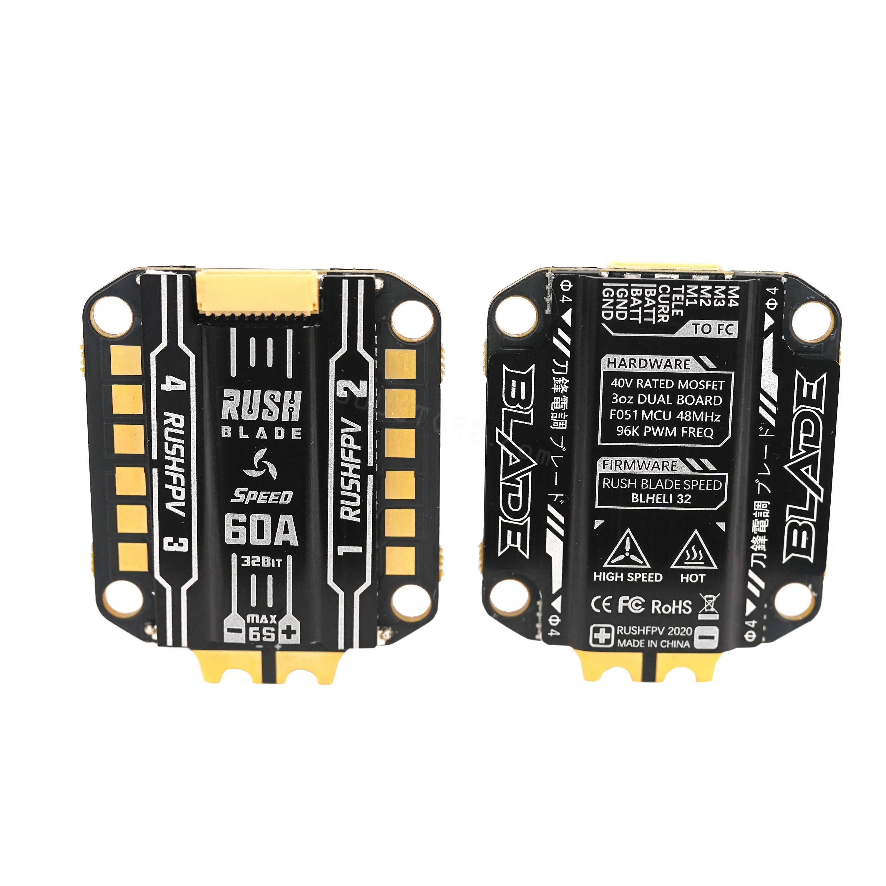 RUSH BLADE 60A 3-6S BLHeli_32 4-in-1 ESC Sport Edition от RUSHFPV features, переднее и заднее специальное алюминиевое покрытие, F350 MCU 48MHZ с прошивкой BLHeli_32, 96K PWM FREQ. 3oz двойная плата и 40V Номинальный MOSFET.