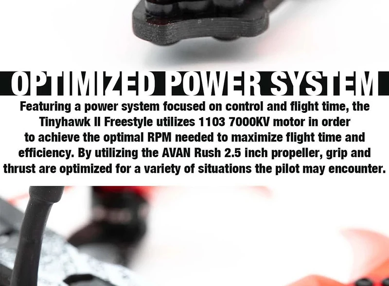 Оптимизированная Система питания:Благодаря энергосистеме, ориентированной на управление и время полета, компания theTinyhawk2 Freestyle использует двигатель 1103 7000KV для достижения оптимальных оборотов в минуту, необходимых для максимального увеличения времени и эффективности работы. За счет использования Аван Раш 2,5 дюйма пропеллеры, хорошо фиксирующую ногу и тяги оптимизированы.