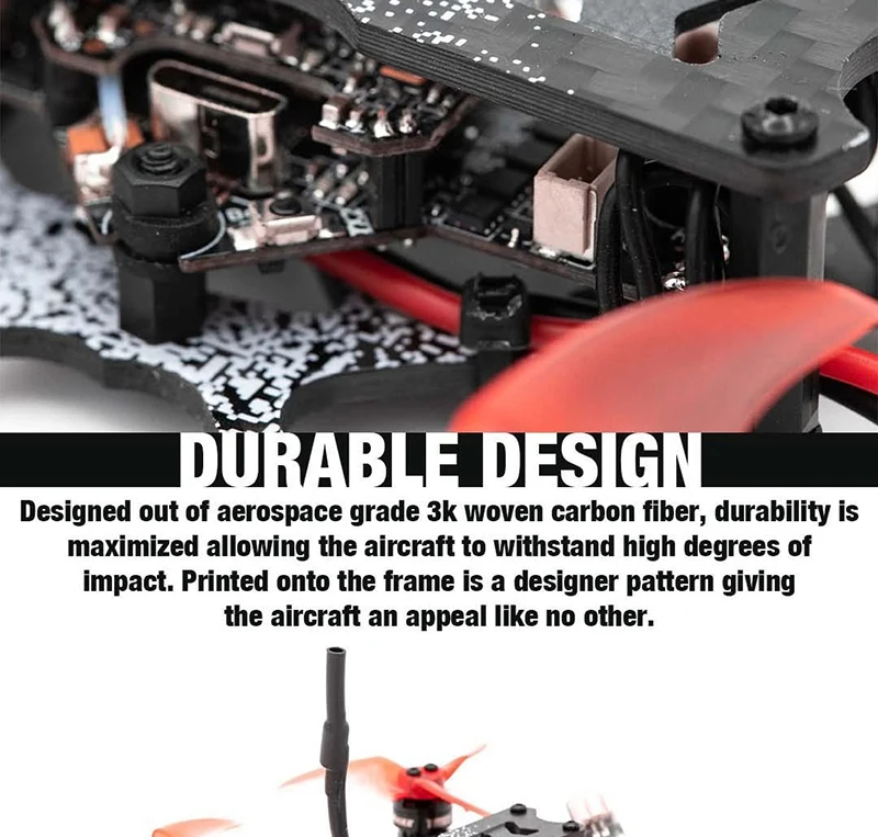 Прочный дизайн:Изготовлено из углеродного волокна авиационного класса 3k, Максимальная прочность позволяет самолетам выдерживать высокие удары. Напечатанный на рамке дизайнерский узор придает самолету привлекательность, как никто другой.