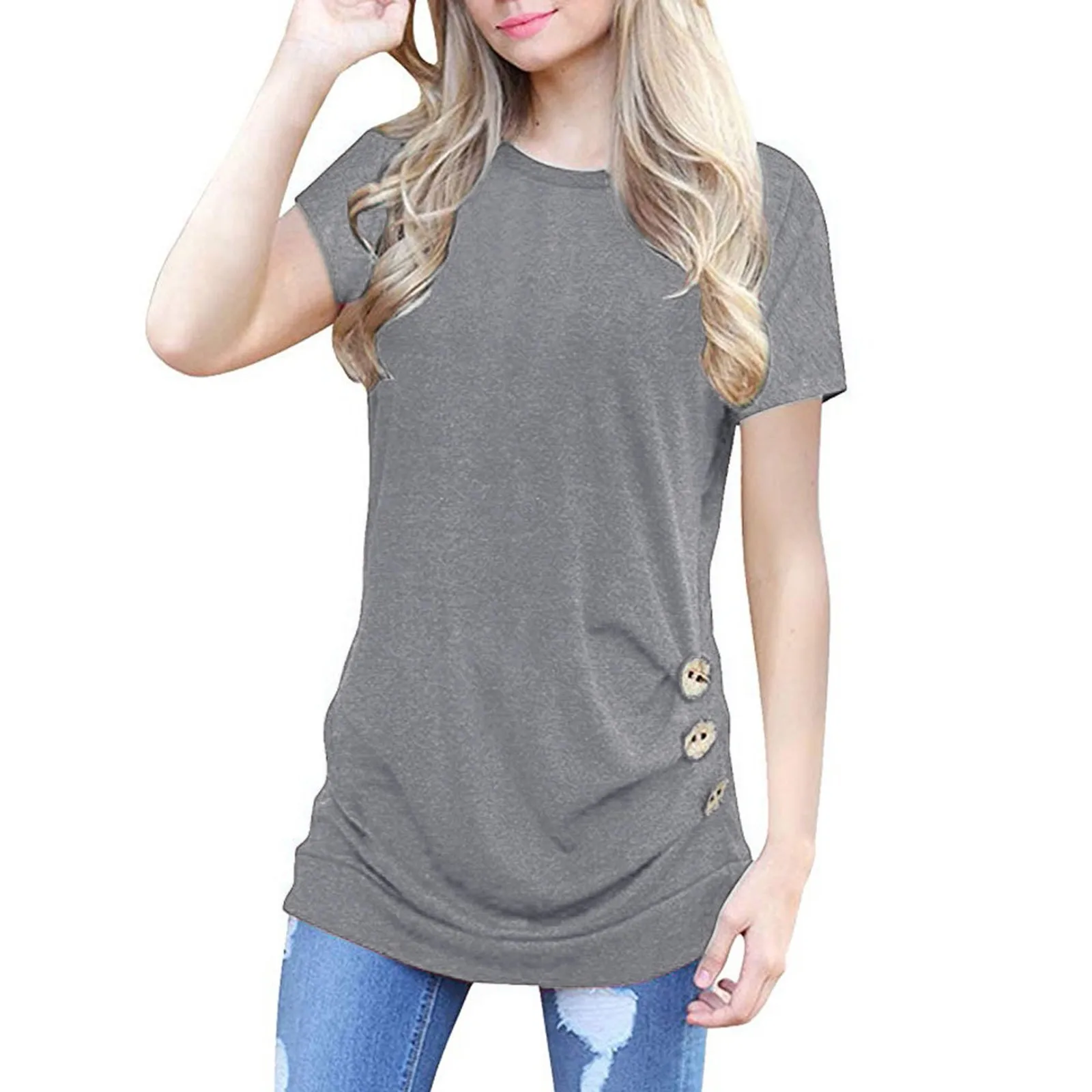 Однотонная футболка, Женская свободная футболка с пуговицами и отделкой, летний топ, футболка с круглым вырезом, футболка с коротким рукавом, туника, женская футболка