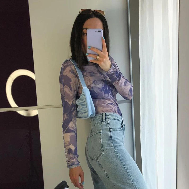 Женские сексуальные прозрачные сетчатые Короткие топы на весну и осень, Женская Прозрачная облегающая футболка с длинным рукавом и абстрактным принтом, фиолетовая