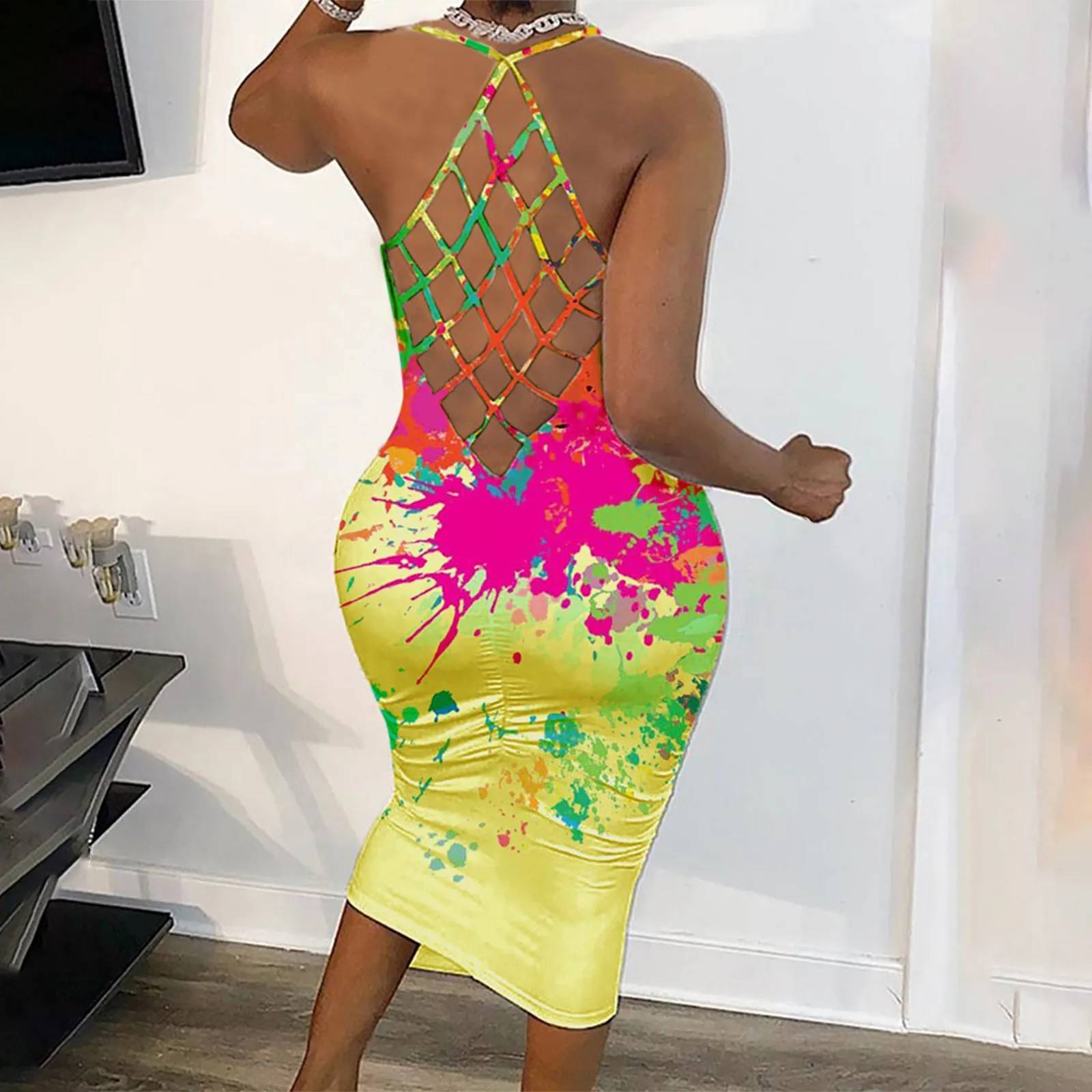 Женские платья 2021, Модные Цветные платья с принтом, сетчатые платья с лямкой на шее, женское платье с круглым вырезом, сексуальное длинное платье, повседневное женское платье