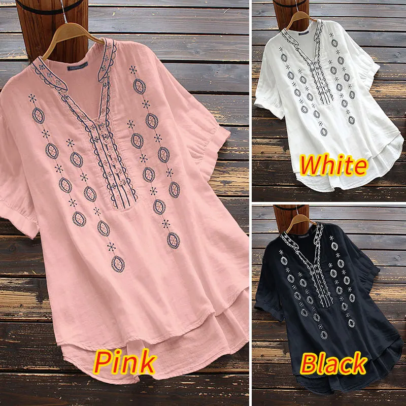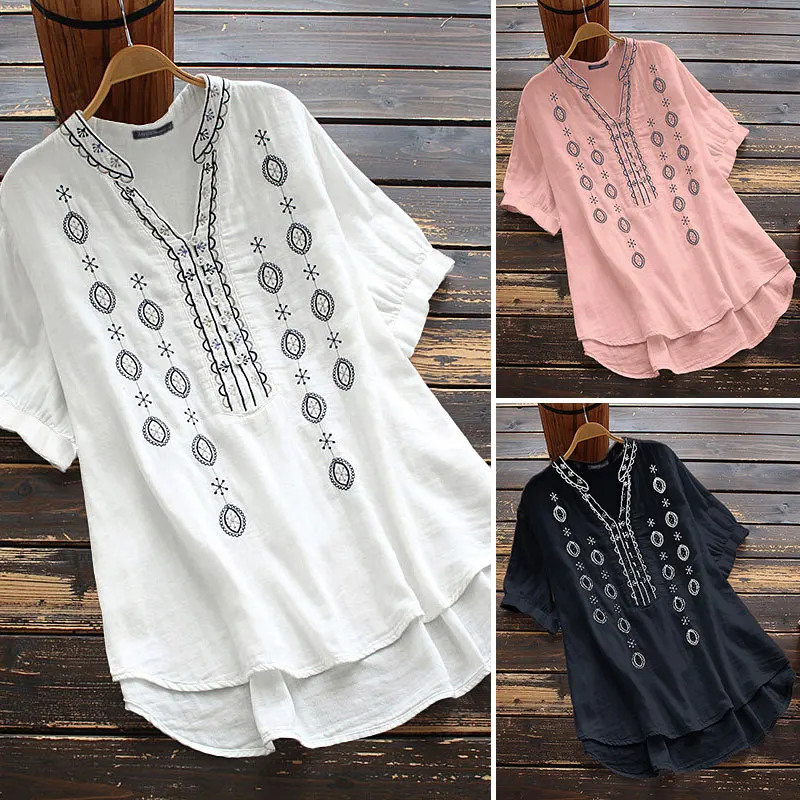 Посылка включает в себя: 1 блузкаМатериал: 100% хлопокЦвета: белый, темно-синий, розовыйРазмер: S,M,L,XL,2XL,Длина рукава: короткий рукавВырез: v-образный вырезУзор: Цветочная вышивкаЦепочка с пряжкой: на пуговицах спередиТолщина: тонкаяХарактеристики: высокий и низкий, чистый хлопокСтиль: Отдых, богемный, ретро, Европейский, Национальный, литературныйСезон: весна, лето, осень, зимаПовод: Семейные, вечерние, пляжные, свадебные, праздничные