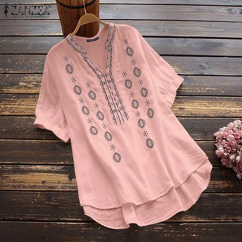 ZANZEA Женская Повседневная хлопковая блуза летняя Туника Топы старинные Блузки с цветочной вышивкой свободного кроя с коротким рукавом, v-образным вырезом и сорочка больших размеров