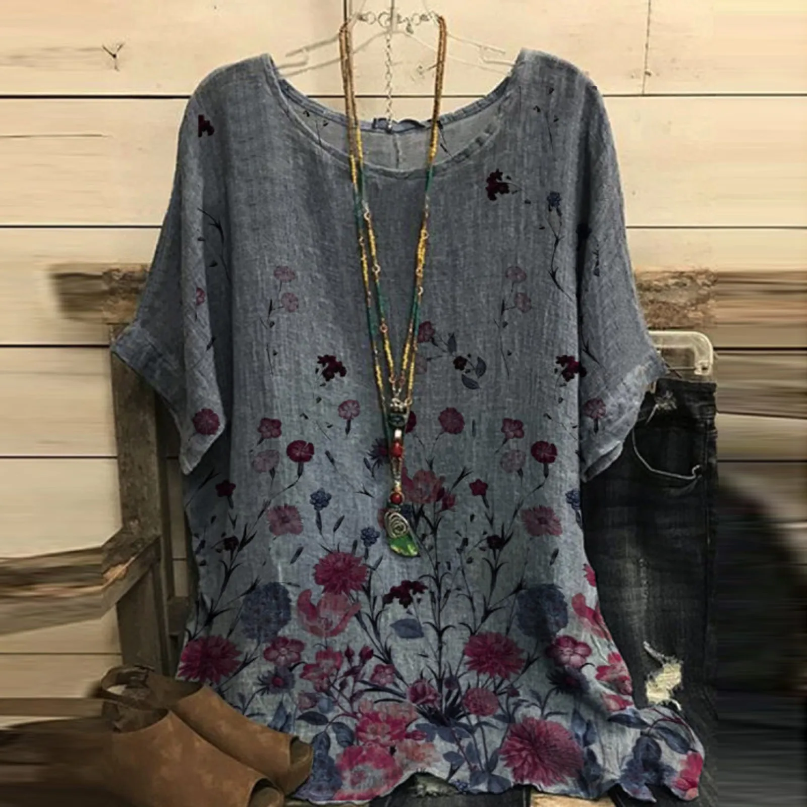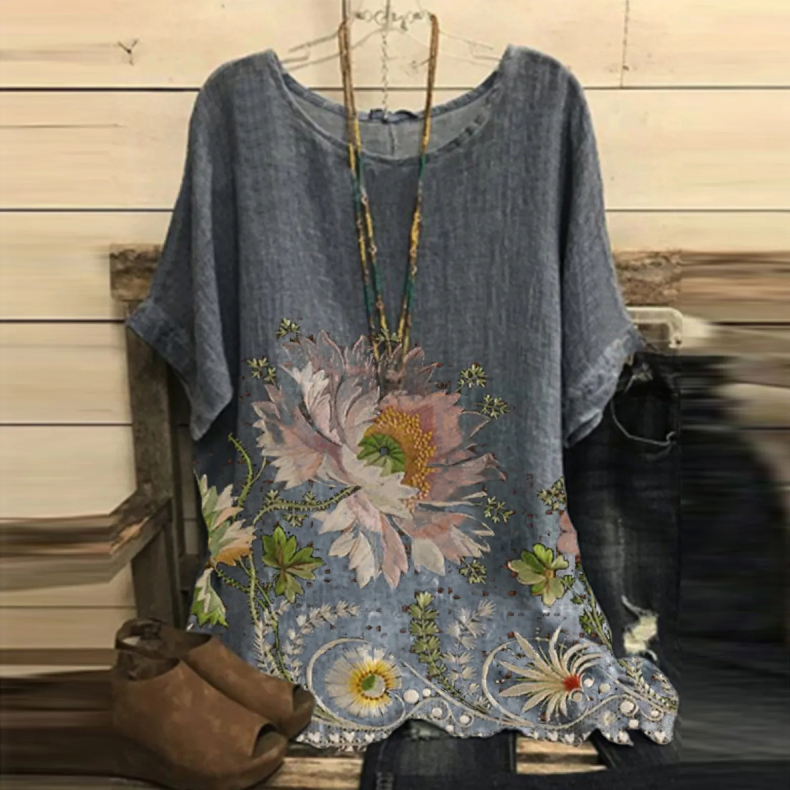 Женская винтажная хлопковая блузка с круглым вырезом и коротким рукавом с цветочным принтом