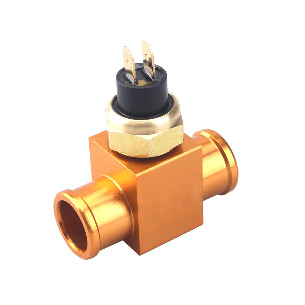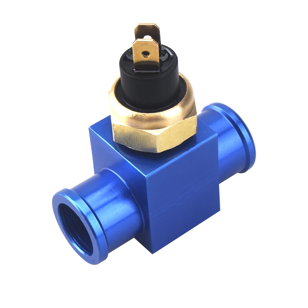 Посылка в комплекте 1 х Алюминиевый соединитель для термопереключателя, диаметр соединения: 22 мм 2 хомута для шланга-нержавеющая сталь 1 х датчик температуры, при температуре 83 ° - 77 ° Резьба: M14x2 мм Вес: 88 г Разъемы: 2x6,3 мм плоский кабель питания