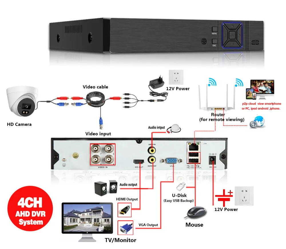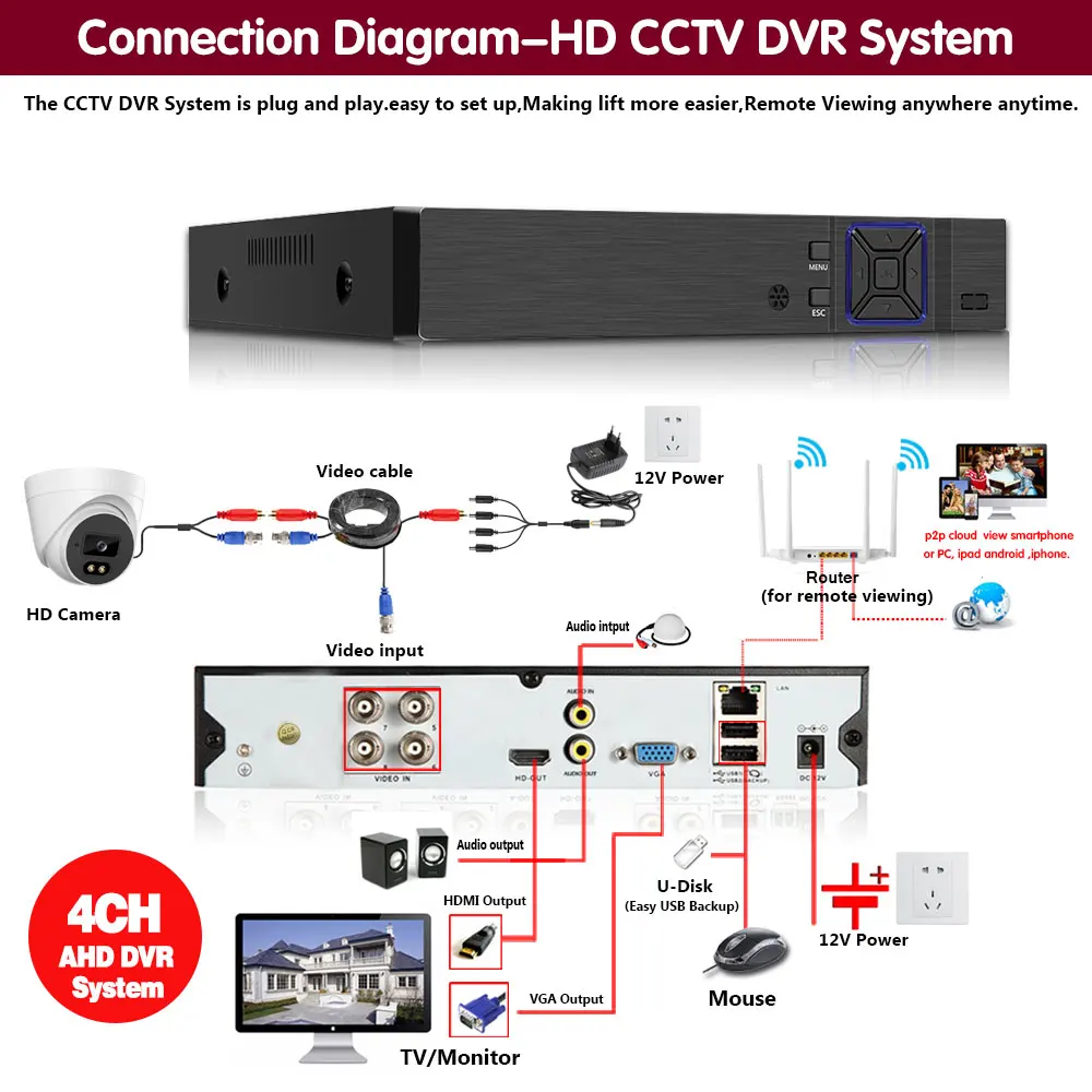 Простая настройка, всего 4 шага для просмотра мобильный телефон, просмотра видео в режиме реального времени из любого места и в любое время с помощью смартфона, стола или ПК с передовой технологией P2P, вы можете получить удаленный доступ к вашей системе за считанные минуты или меньше, нет необходимости в переадресации, удаленный доступ никогда не был таким простым