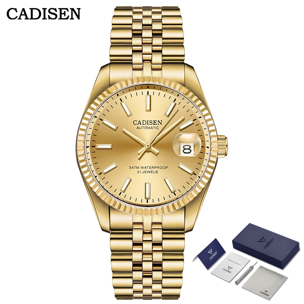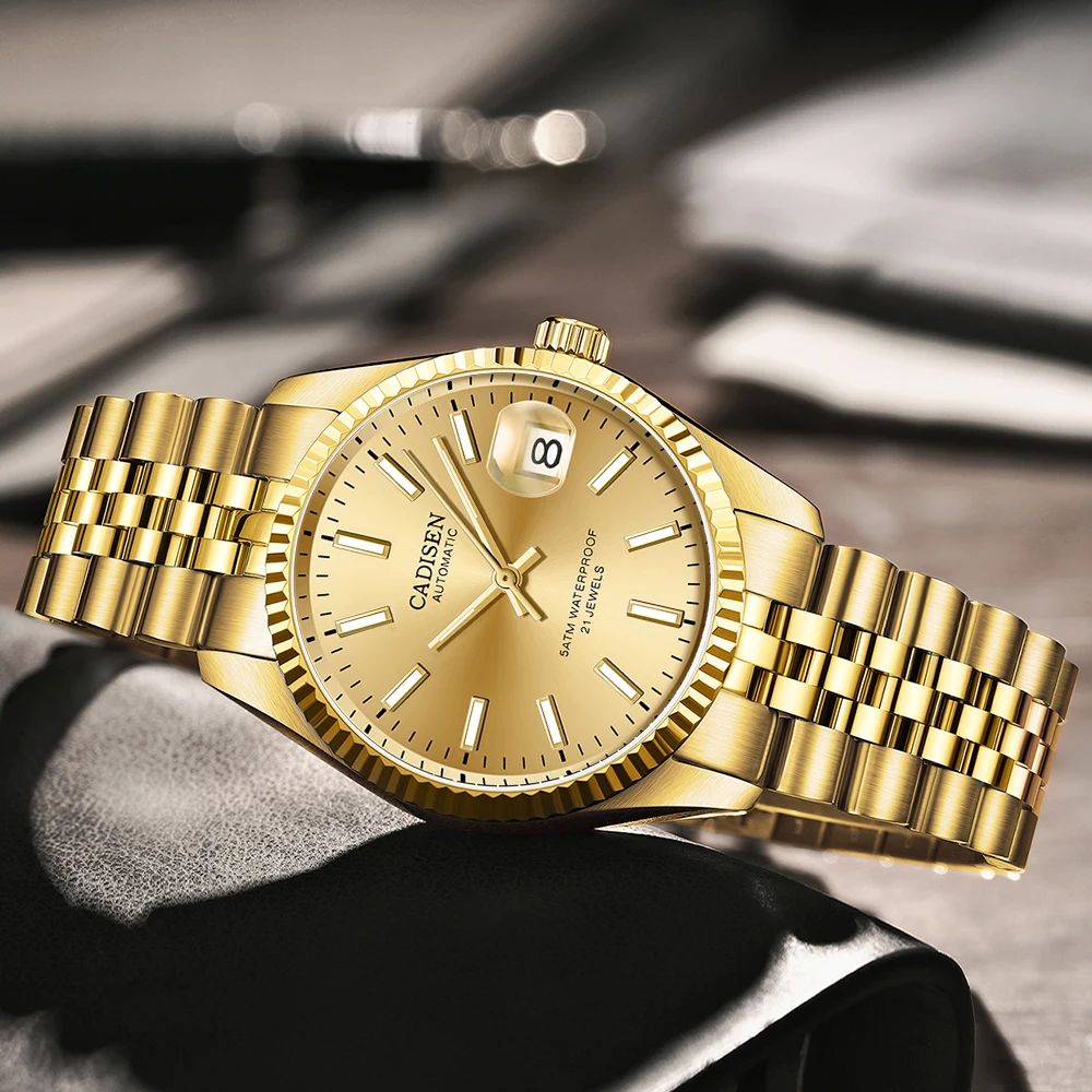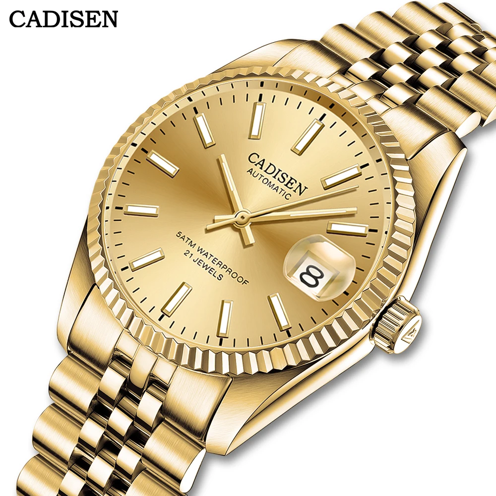 Часы наручные CADISEN Мужские механические, автоматические золотистые Роскошные полностью из нержавеющей стали с сапфировым стеклом и датой, водонепроницаемость 50 м