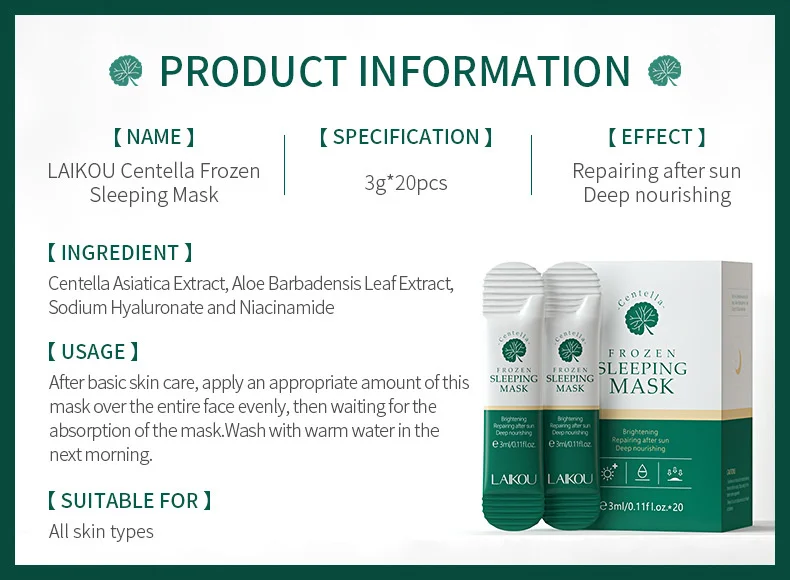 20 шт.кор. центеллы увлажняющая для сна маска глубоко увлажняющий питательный ремонт после пребывания на солнце уход за лицом уход за кожей ремонт