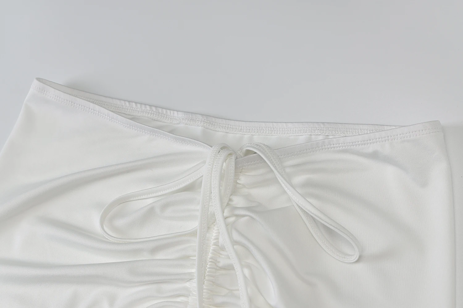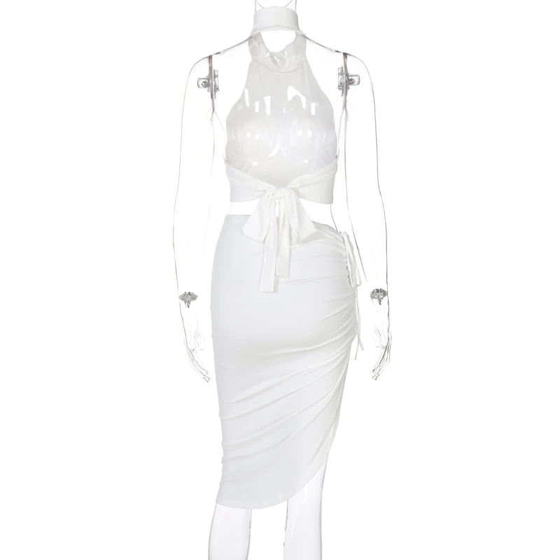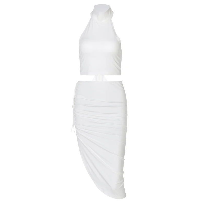 Летняя женская белая короткая юбка из 2 предметов + Привлекательный Топ без рукавов с открытой спиной, Клубная майка с лямкой на шее, жилет на пупке, с разрезом, Новинка